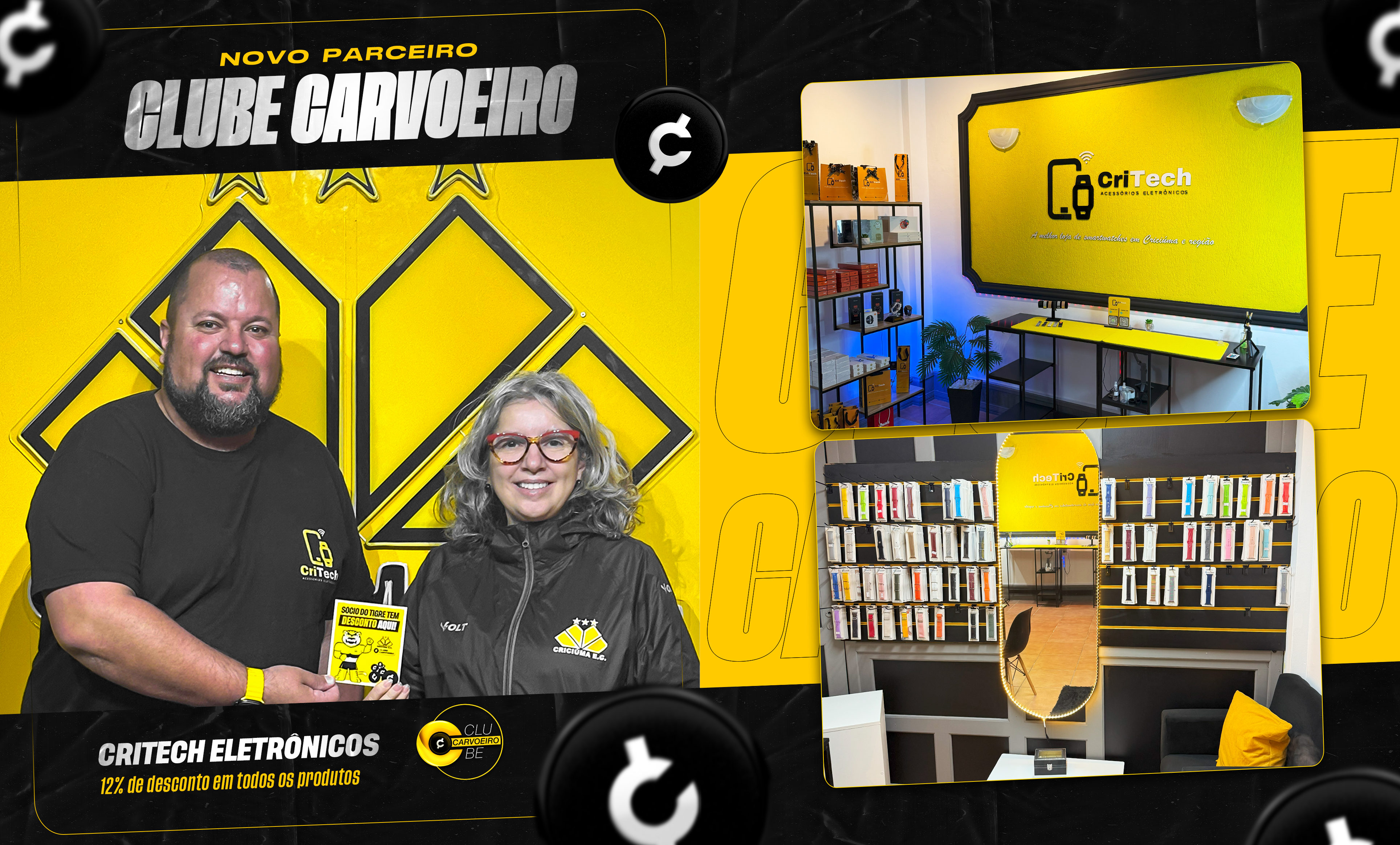 A Critech Eletrônicos é a nova parceira do Clube Carvoeiro, oferecendo benefícios exclusivos para os sócios do Criciúma. A assinatura do contrato aconteceu no estádio Heriberto Hülse, contando com a presença de Viviani Olimpio, gerente comercial e de marketing do clube, e de Miguel André Miranda, representante da Critech.