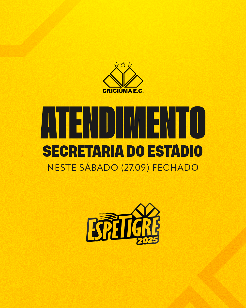 A Secretaria do Criciúma não terá atendimento ao público neste sábado (27/09) em função da realização da Espetigre, tradicional evento do clube.