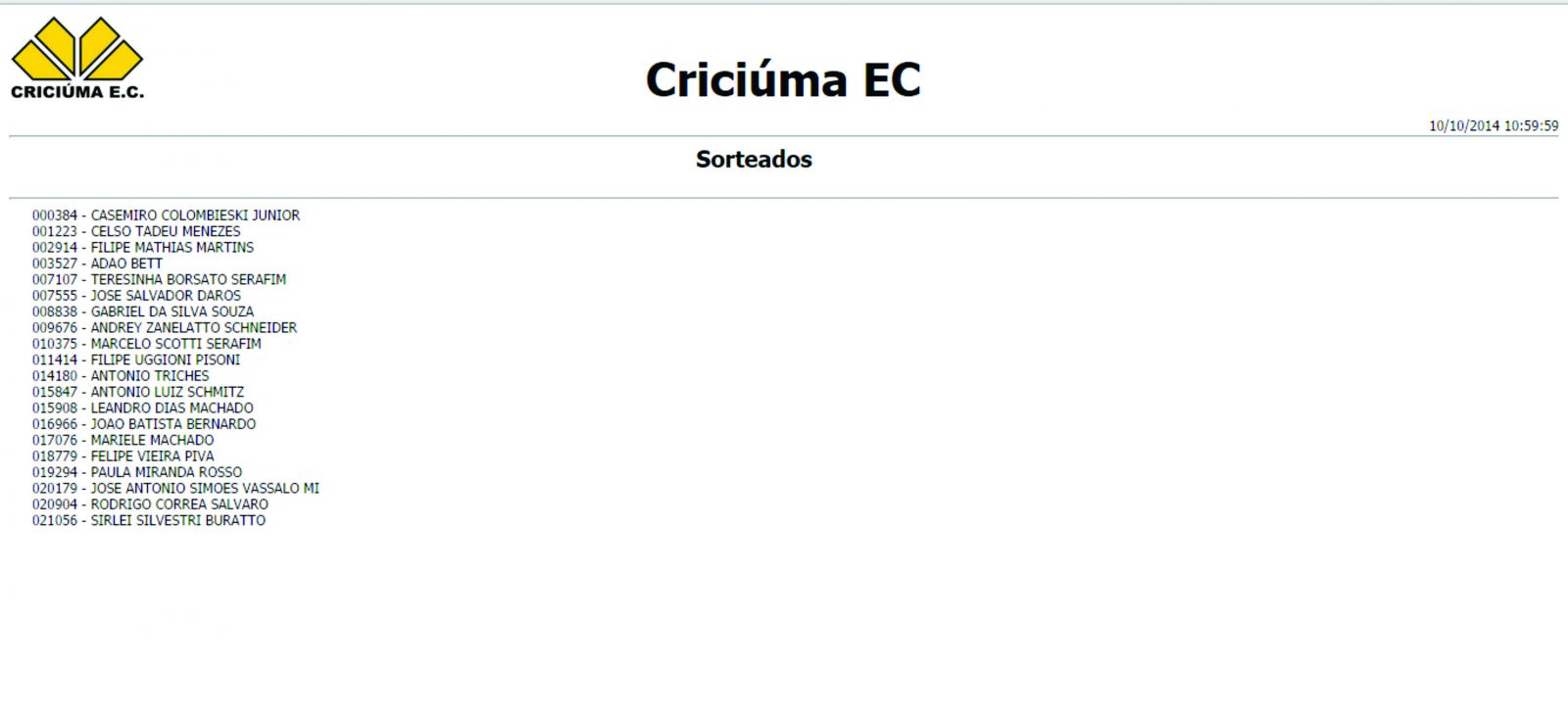 O Criciúma sorteou 20 ingressos de arquibancada entre os sócios em dia com o clube. O sorteio ocorreu na manhã desta sexta-feira (10/10), através de um sistema automático. As entradas são para o jogo deste domingo (12/10) contra o Santos, às 18h30min, no estádio Heriberto Hülse.