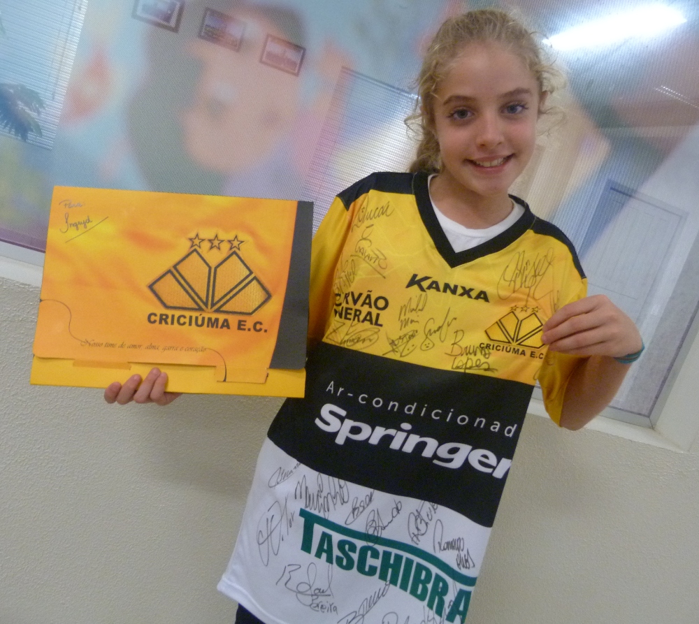 No futebol também é assim: a primeira camiseta a gente nunca esquece. Para a aluna do Bairro da Juventude, Ingryd Floriano Fernandes, 12 anos, o presente recebido esta manhã (17) tem um gostinho todo especial. A menina foi presenteada pelo Clube com uma camisa oficial do Tigre, autografada pelos jogadores, e que traz uma numeração exclusiva desenhada pela própria garota.