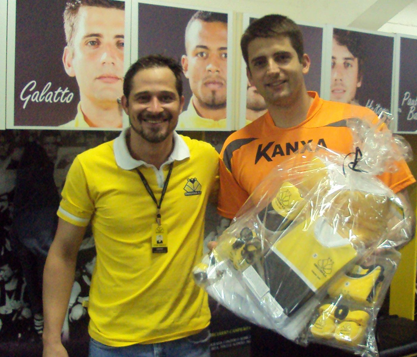 O goleiro Galatto recebeu na manhã desta segunda-feira (10/11) um enxoval infantil feminino. No dia 27 de janeiro do próximo ano nascerá a primeira filha do jogador e da esposa dele, Jacieli. O kit foi enviado pela empresa Torcida Baby, que fabrica produtos licenciados da linha bebê e infantil do Criciúma para a loja Tigre Maníacos. A empresa da kits para presentear os papais do ano.