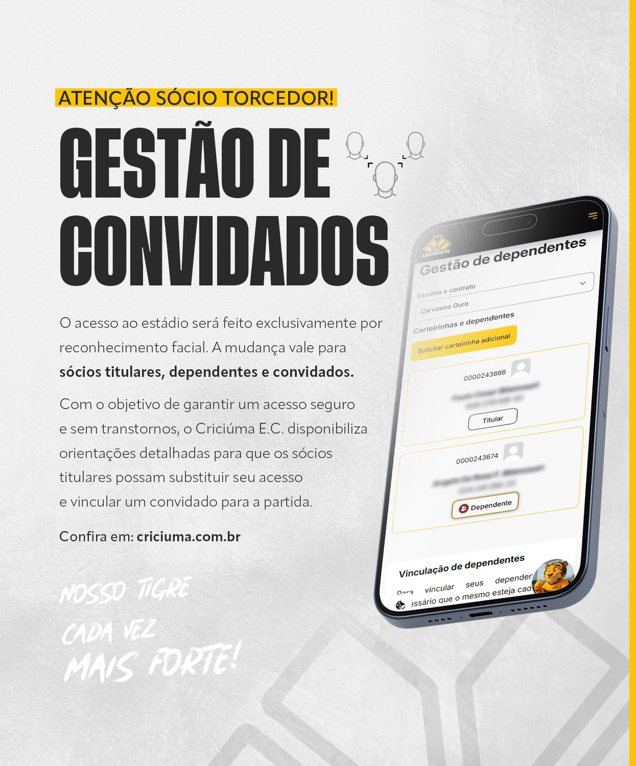 Com o objetivo de garantir um acesso seguro e sem transtornos, o Criciúma Esporte Clube disponibiliza orientações detalhadas para que os sócios titulares possam substituir seu acesso e vincular um convidado para a partida.