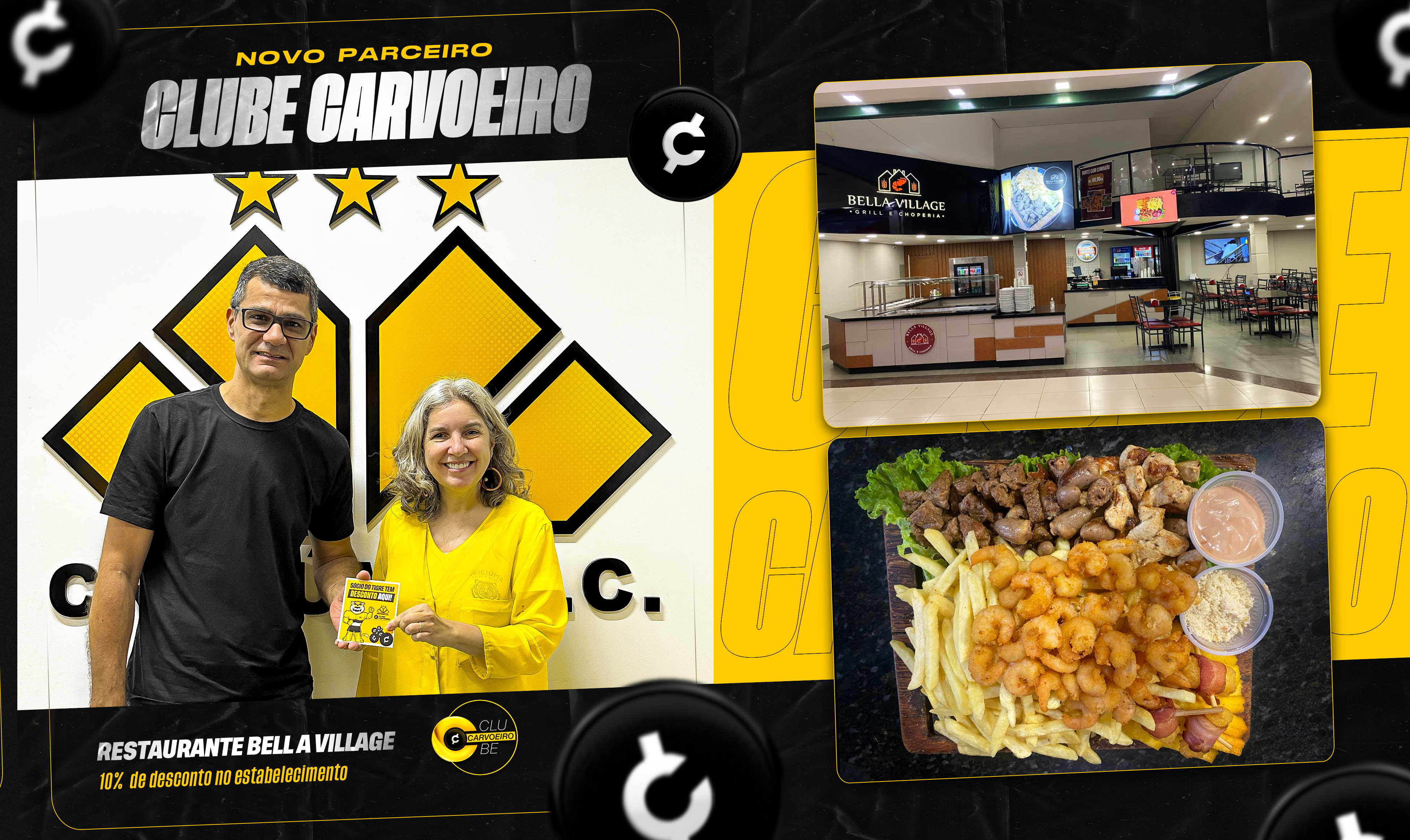 O Restaurante Bella Village, é o novo parceiro do Clube Carvoeiro, oferecendo benefícios exclusivos para os sócios do Criciúma. A assinatura do contrato aconteceu no estádio Heriberto Hülse, contando com a presença de Viviani Olimpio, gerente comercial e de marketing do clube, e Volmir Felizardo, representante do Bella Village.
