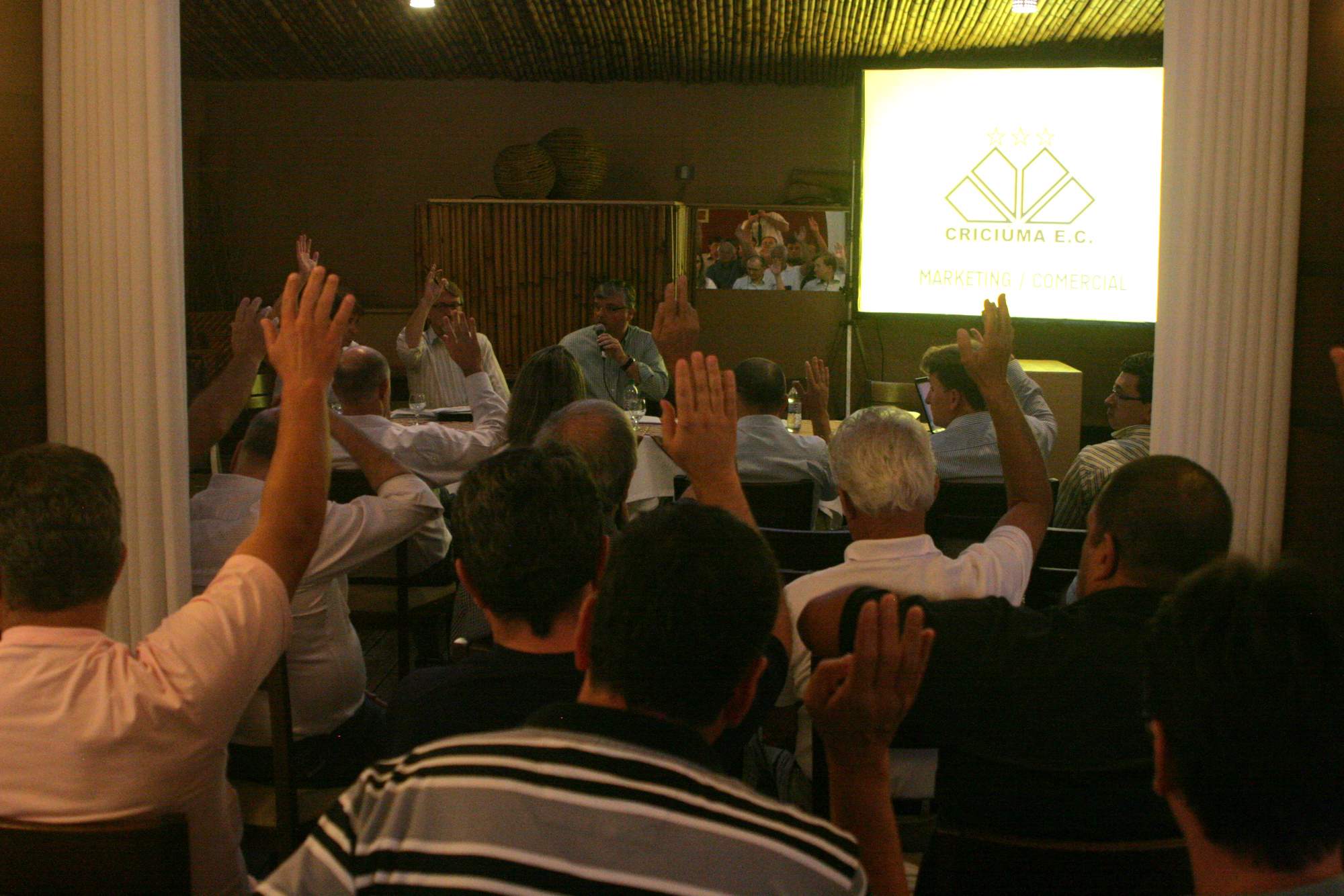 Legenda: Reunião do Conselho Deliberativo do Criciúma Esporte Clube ocorreu na noite desta quarta-feira (16/01) no Centro de Eventos Oasis. Na foto, o diretor comercial e de marketing, Cláudio Gomes, apresenta nos planos de sócios