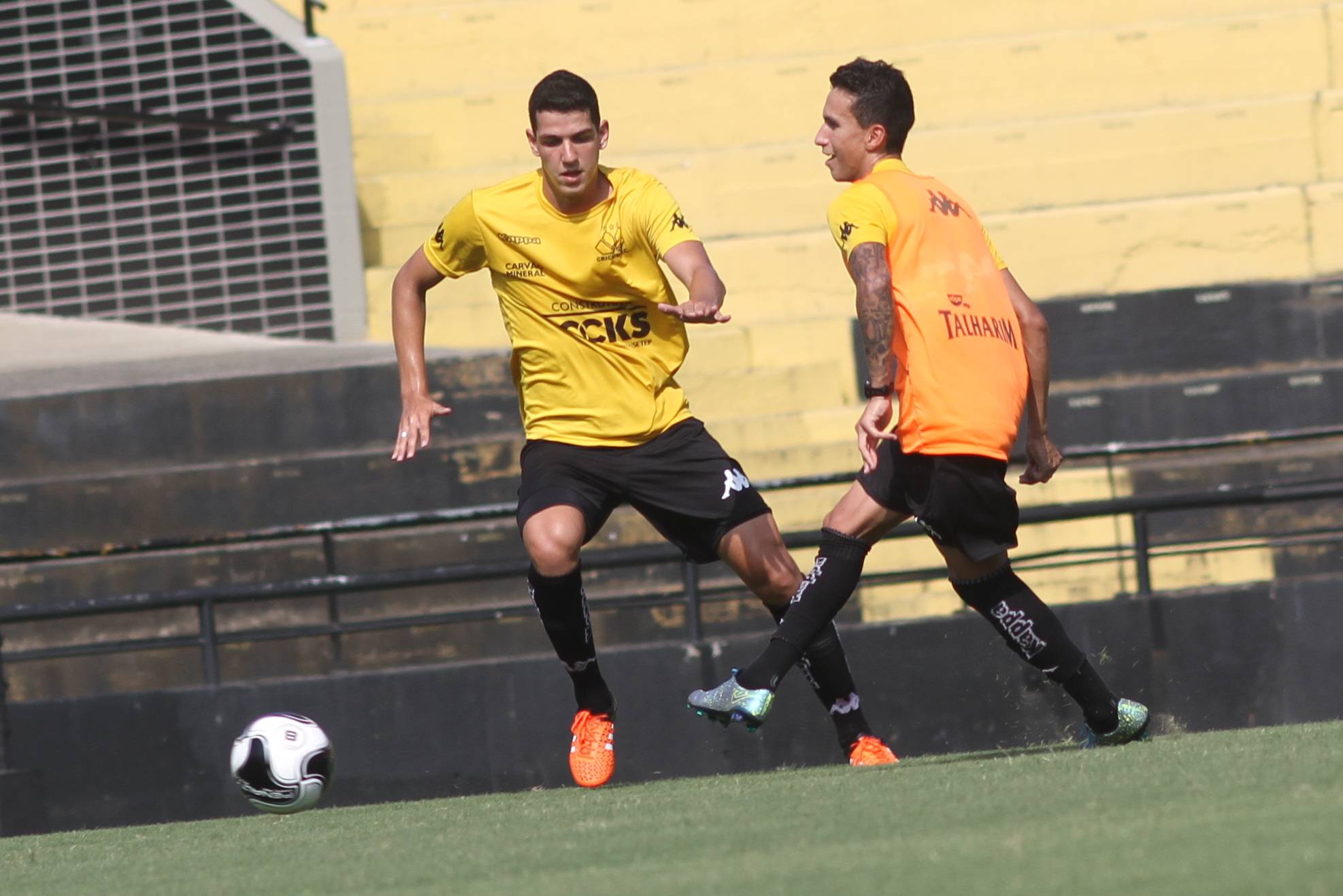 Legenda: Nino e Douglas Moreira durante treino do Criciúma na tarde desta sexta-feira (29/01), no estádio Heriberto Hülse