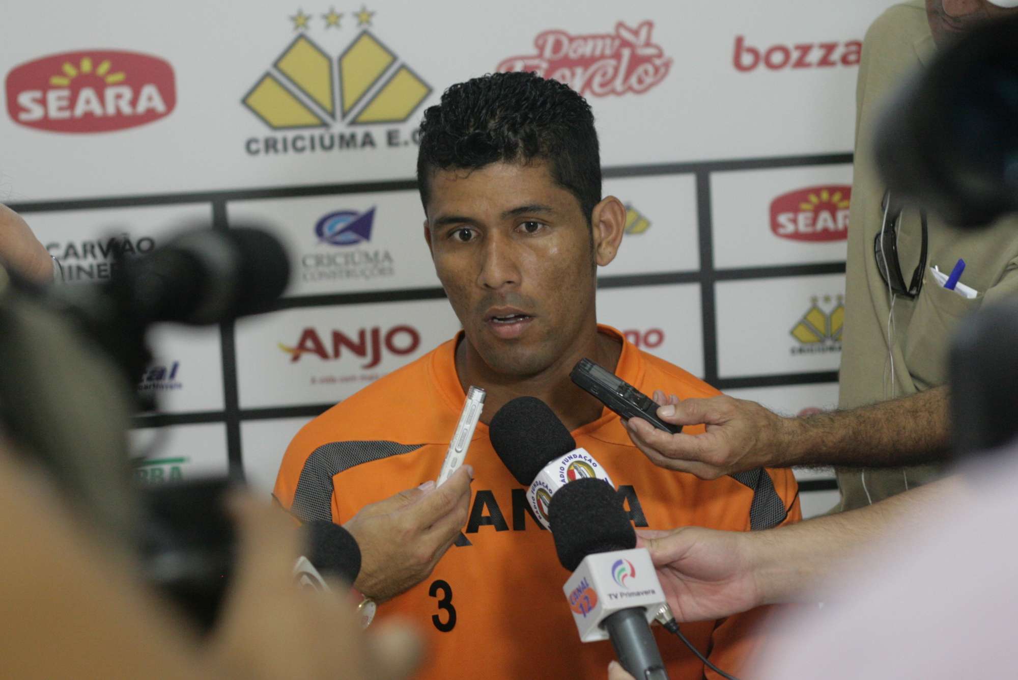 Legenda: Marlon concede entrevista coletiva na tarde desta sexta-feira (25/01) na sala de imprensa do estádio Heriberto Hülse.