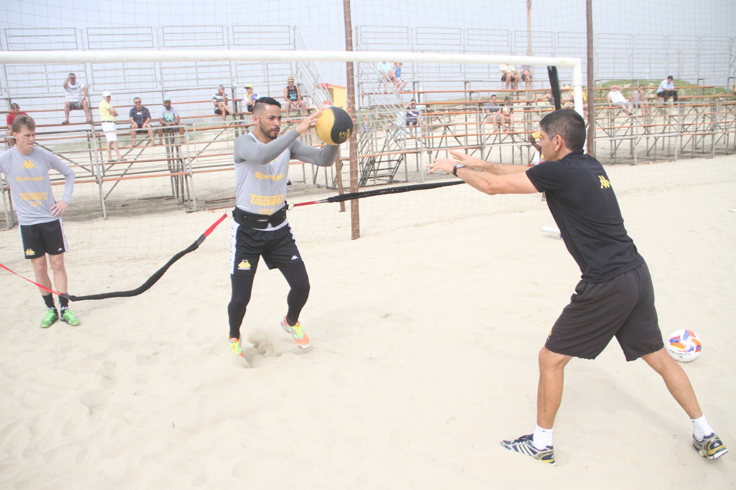 Legenda: Torcida acompanhou treino na Arena do Praião, na Zona Norte do Balneário Rincão, na manhã deste sábado (09/01). Na foto, Luiz e preparador de goleiros, Mauricio Dacoregio
