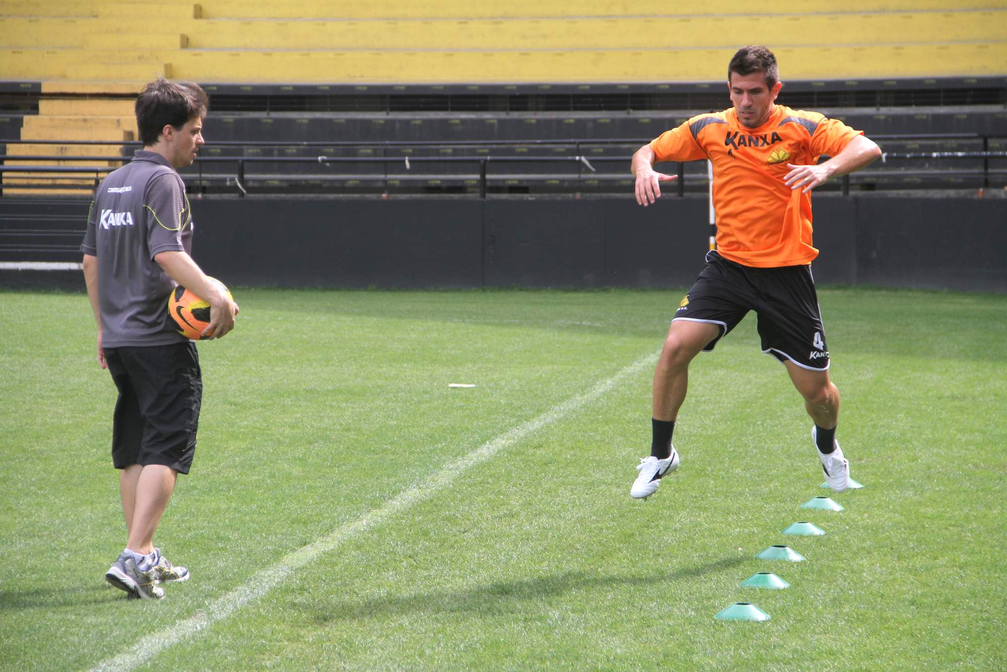 Legenda: Volante Ruan durante trabalho de recuperação no estádio Heriberto Hülse na tarde desta terça-feira (26/11)