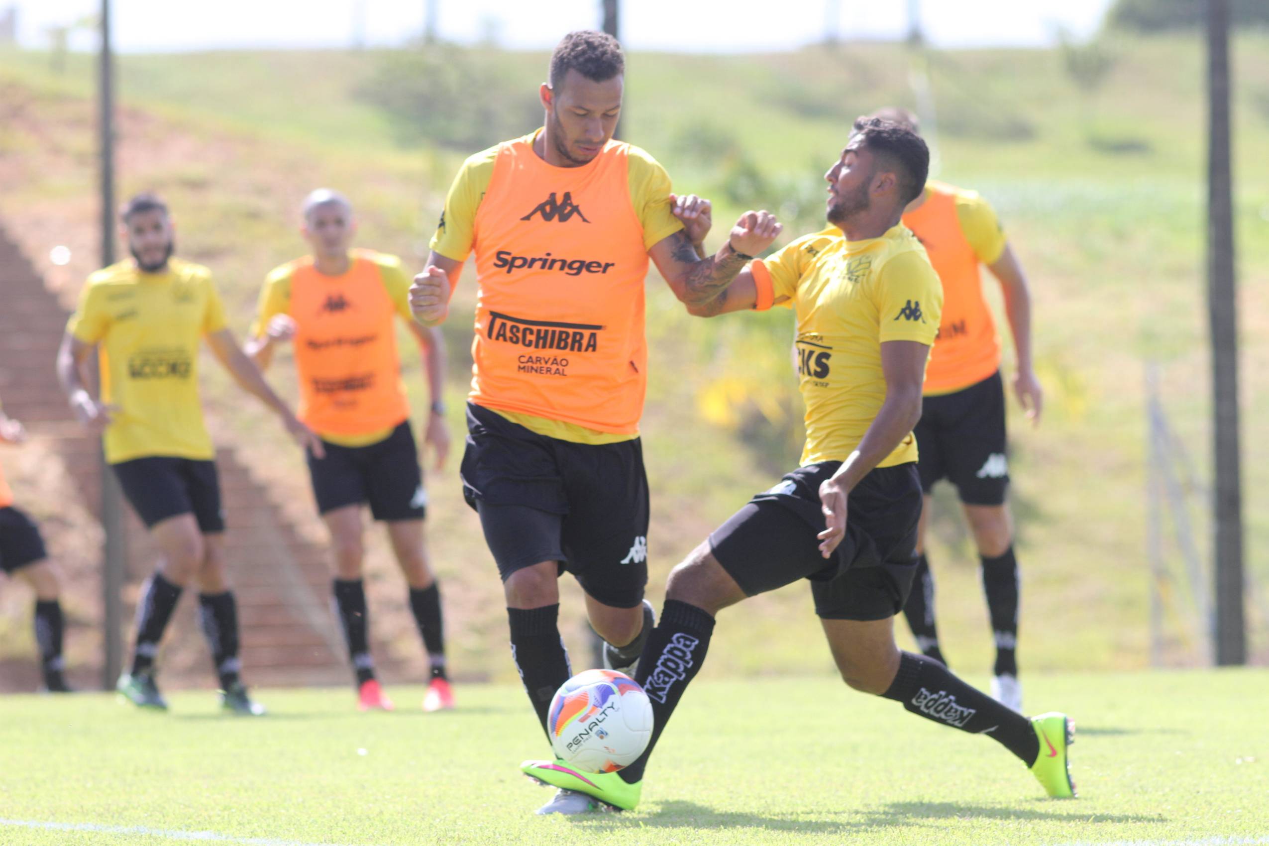Legenda: Alex Santana e Élvis durante treino do Criciúma na tarde desta sexta-feira (22/01), no Centro de Treinamento, no bairro Cristo Redentor