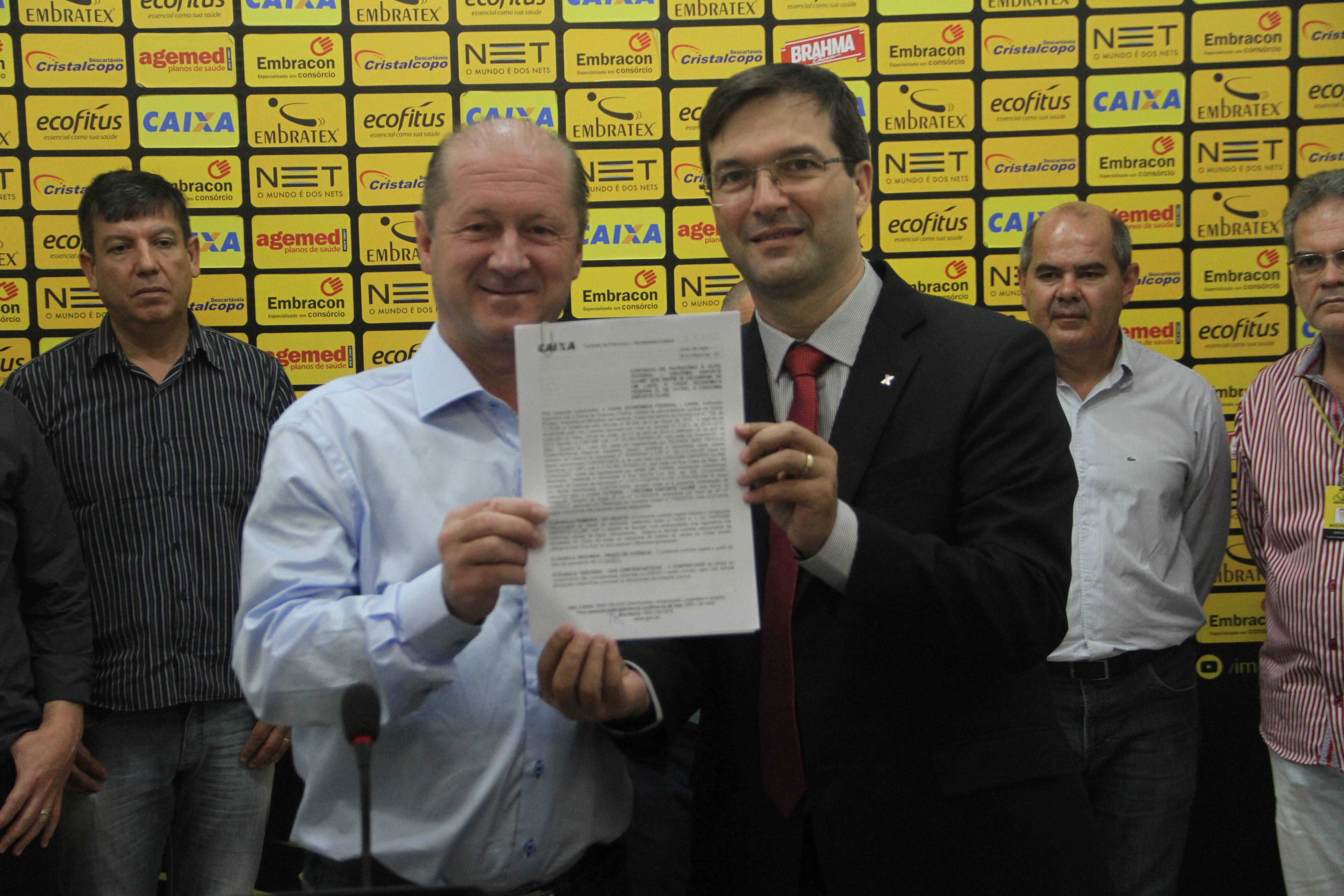 Legenda: Presidente do Criciúma, Jaime Dal Farra, e o superintendente regional do Sul de Santa Catarina, da Caixa Econômica Federal, Ricardo Bier Troglio, na assinatura de contrato de patrocínio na manhã desta sexta-feira (10/03) Fotos: Fernando Ribeiro/www.criciuma.com.br Download
