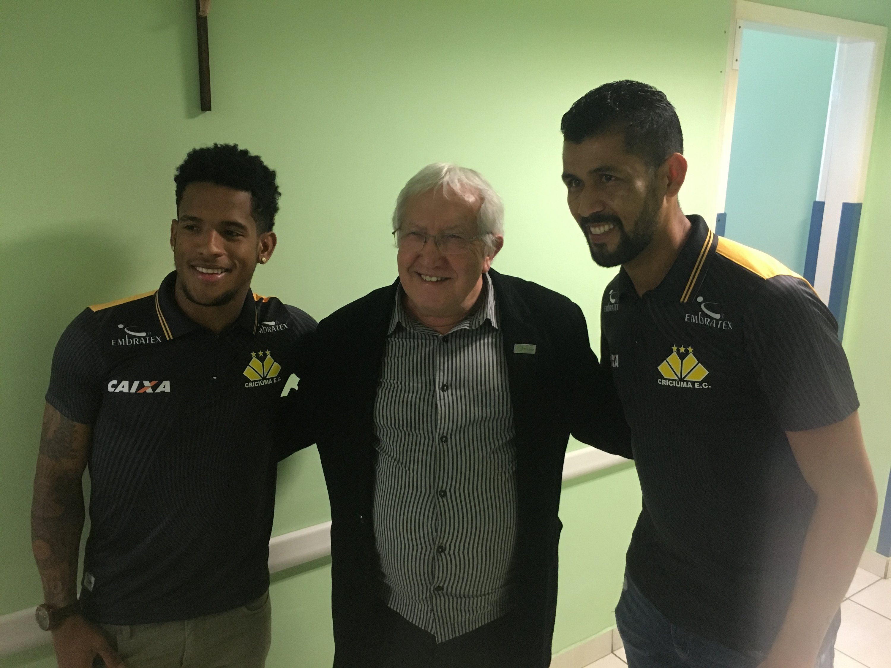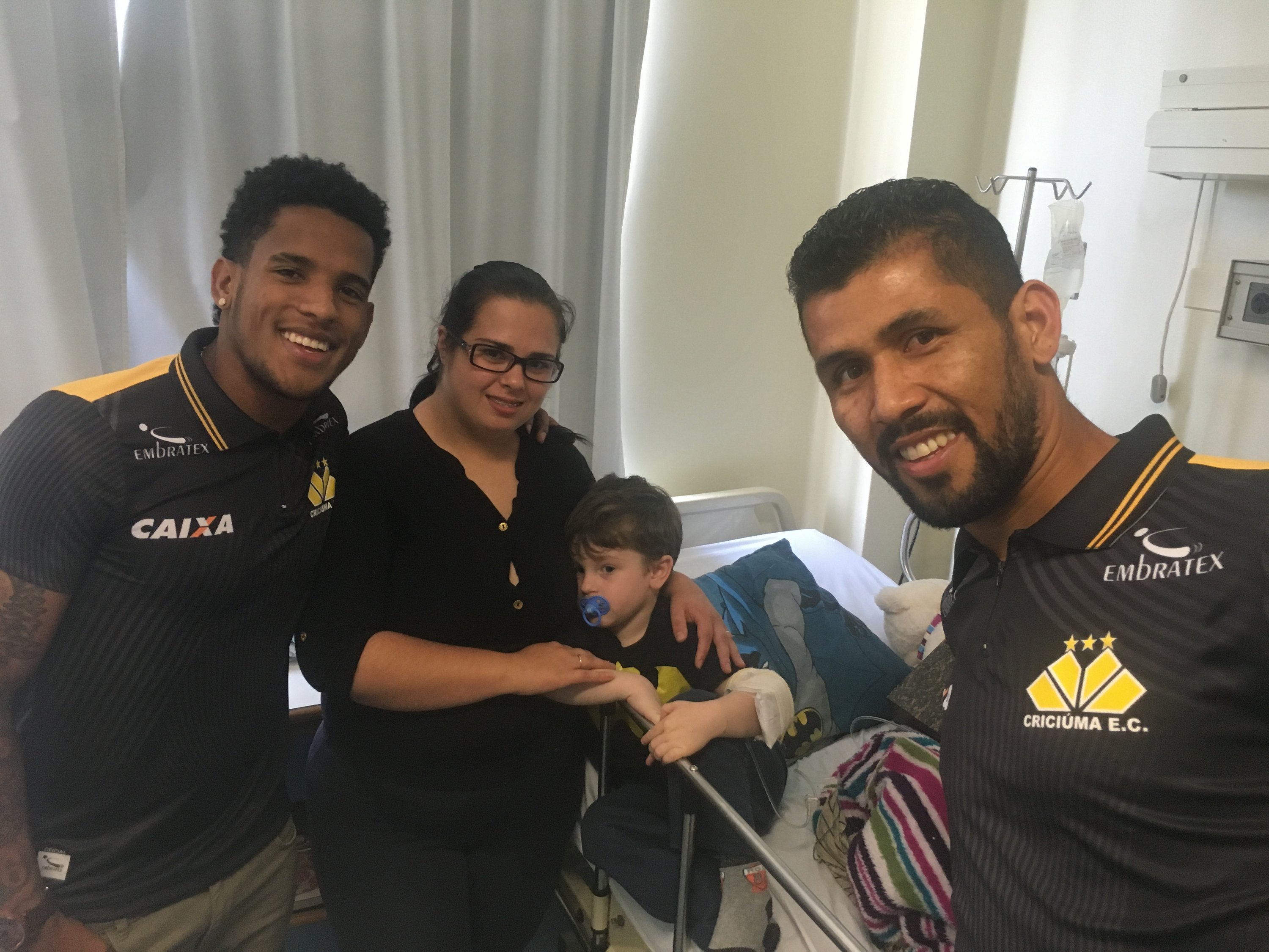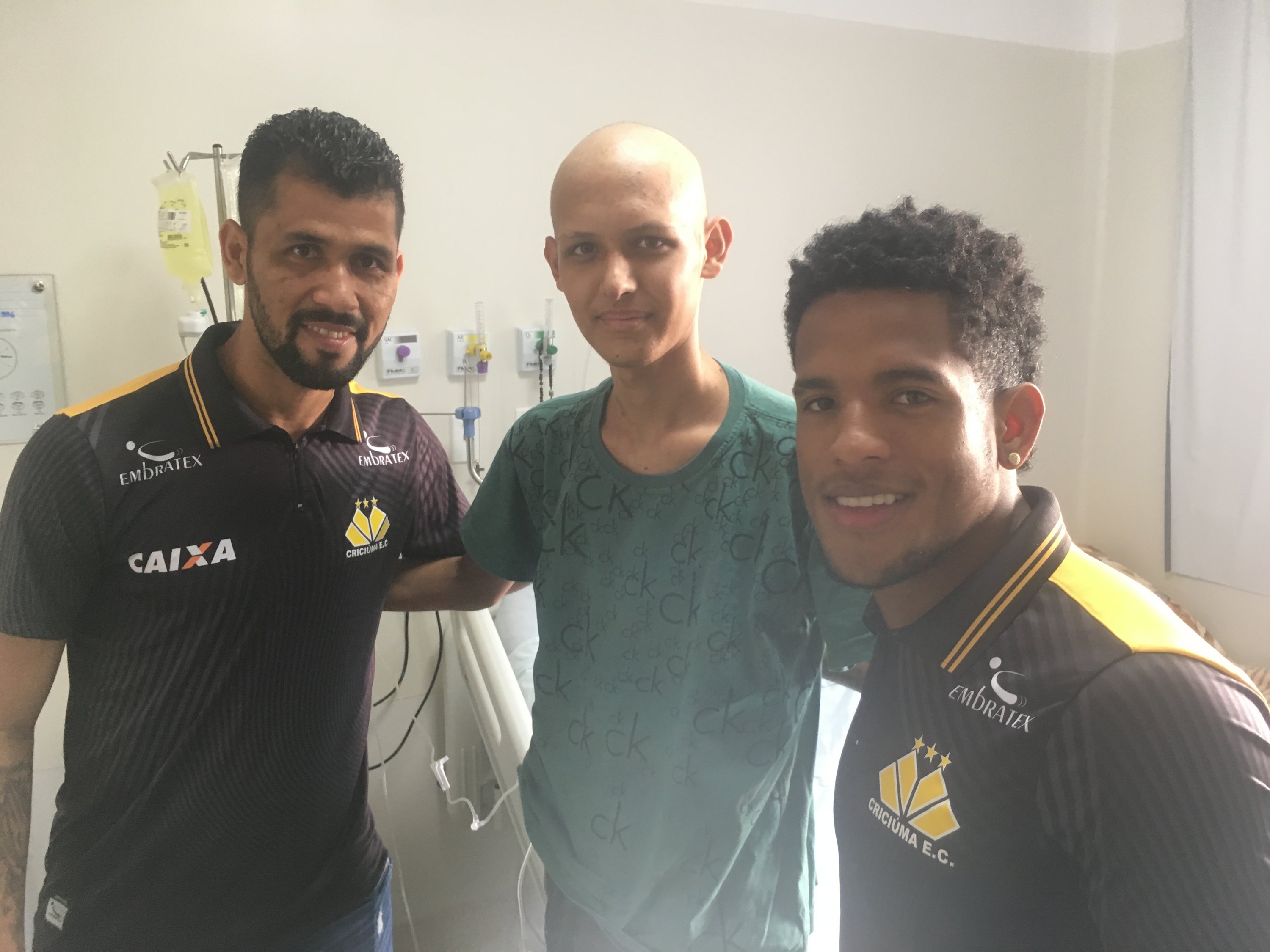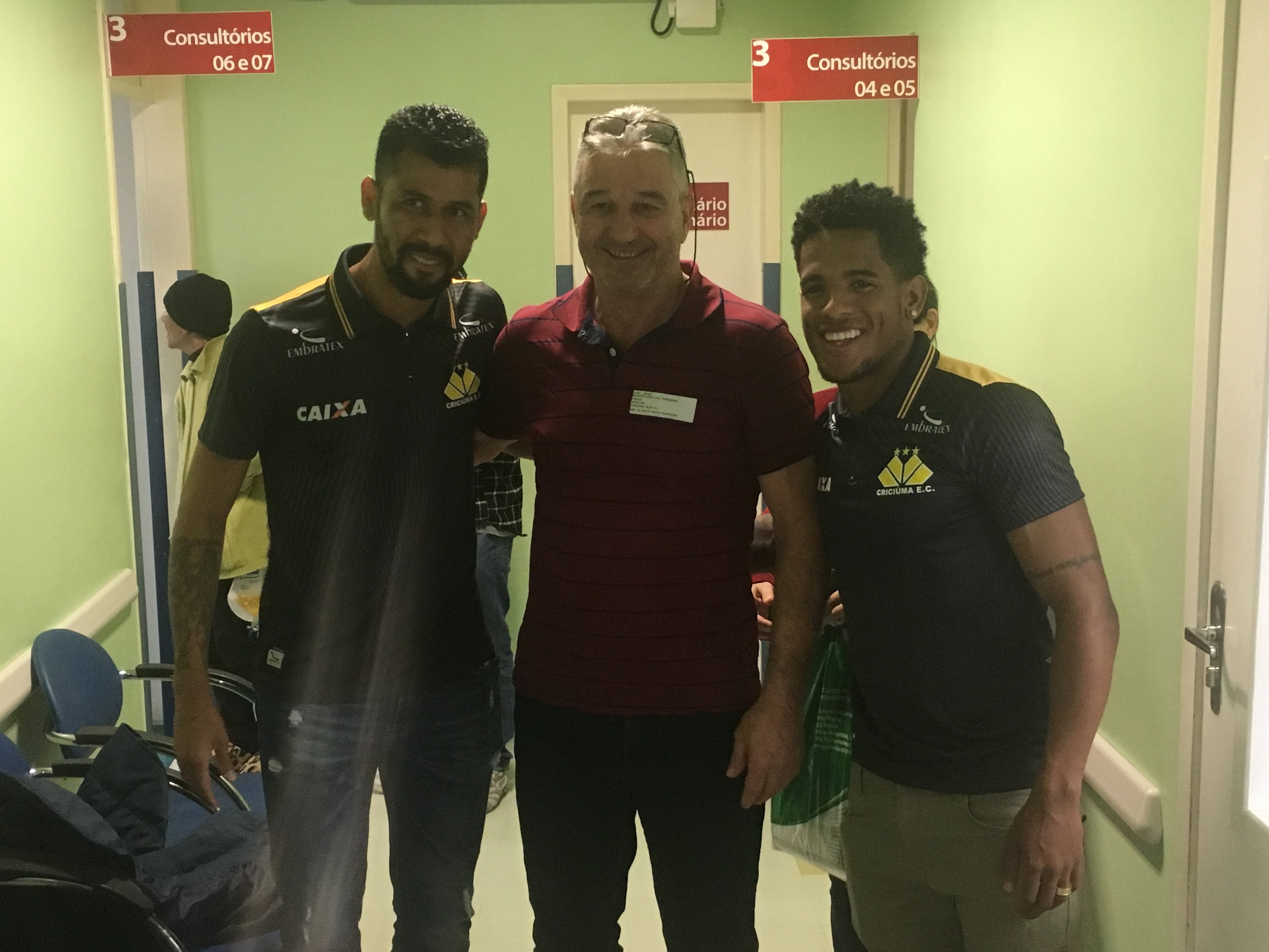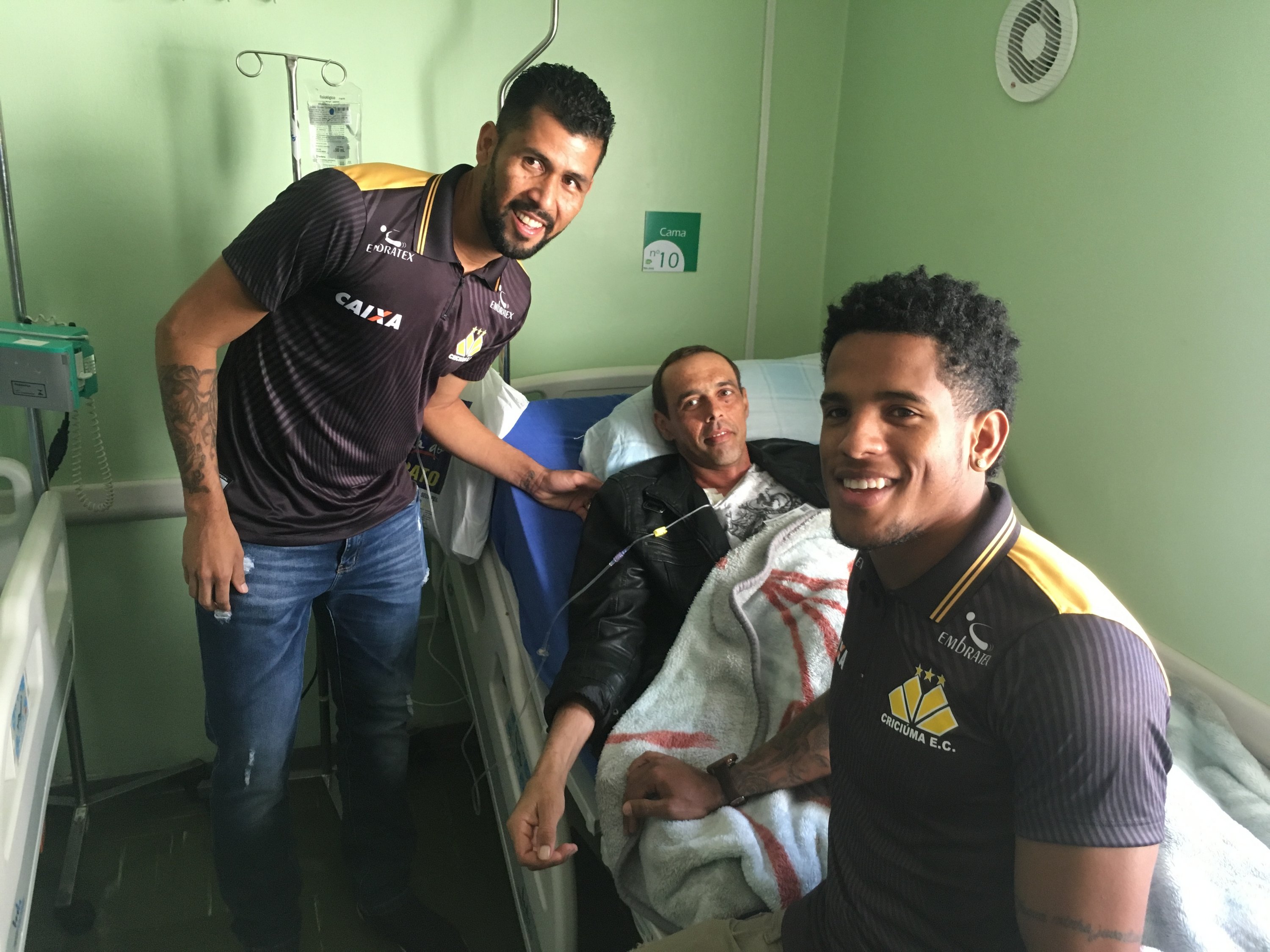 Legenda: Atacante Vitor Feijão e o lateral esquerdo Marlon visitaram o Hospital São José na manhã desta quinta-feira (14/09) Fotos: Fernando Ribeiro/www.criciuma.com.br Download