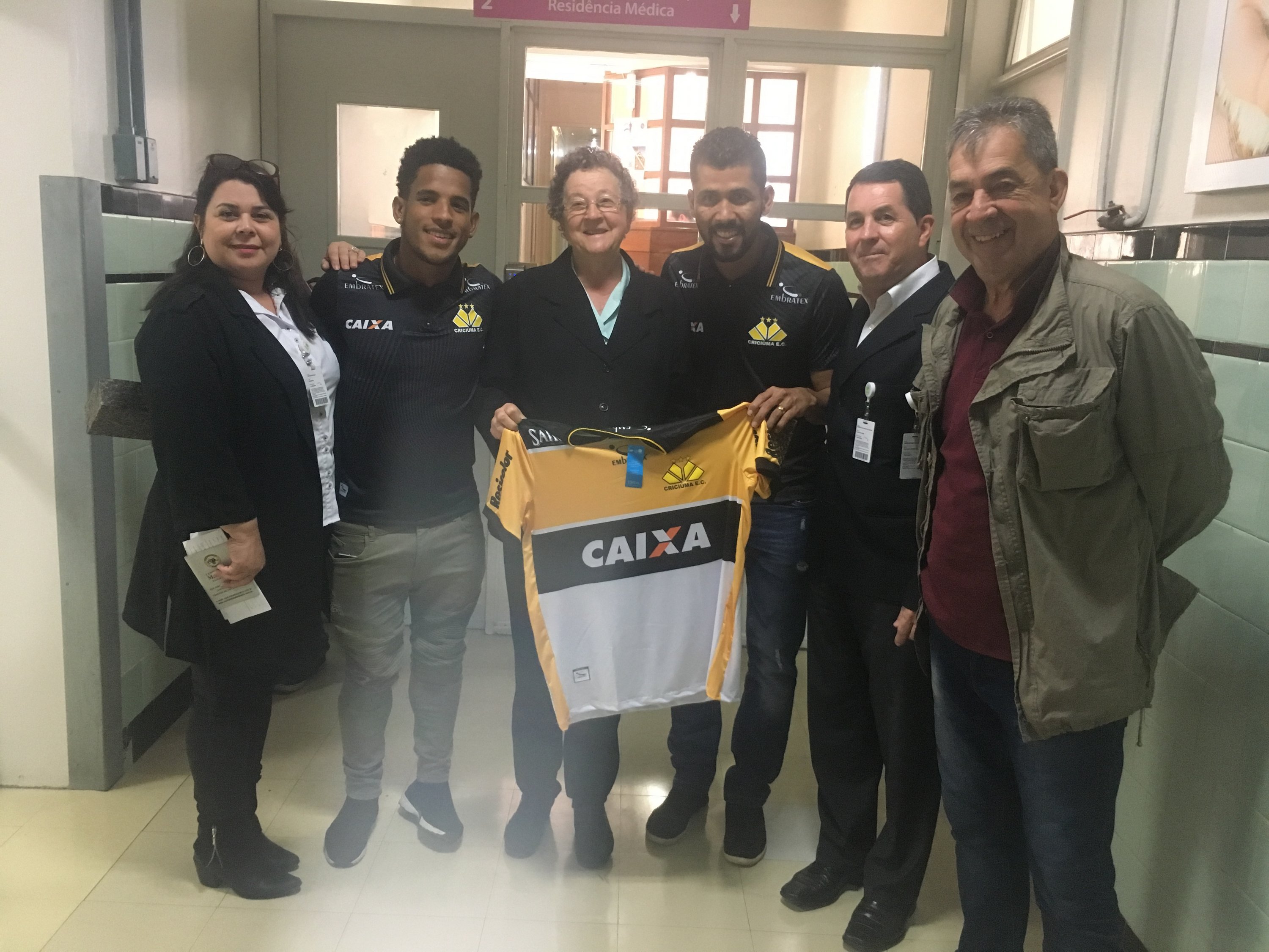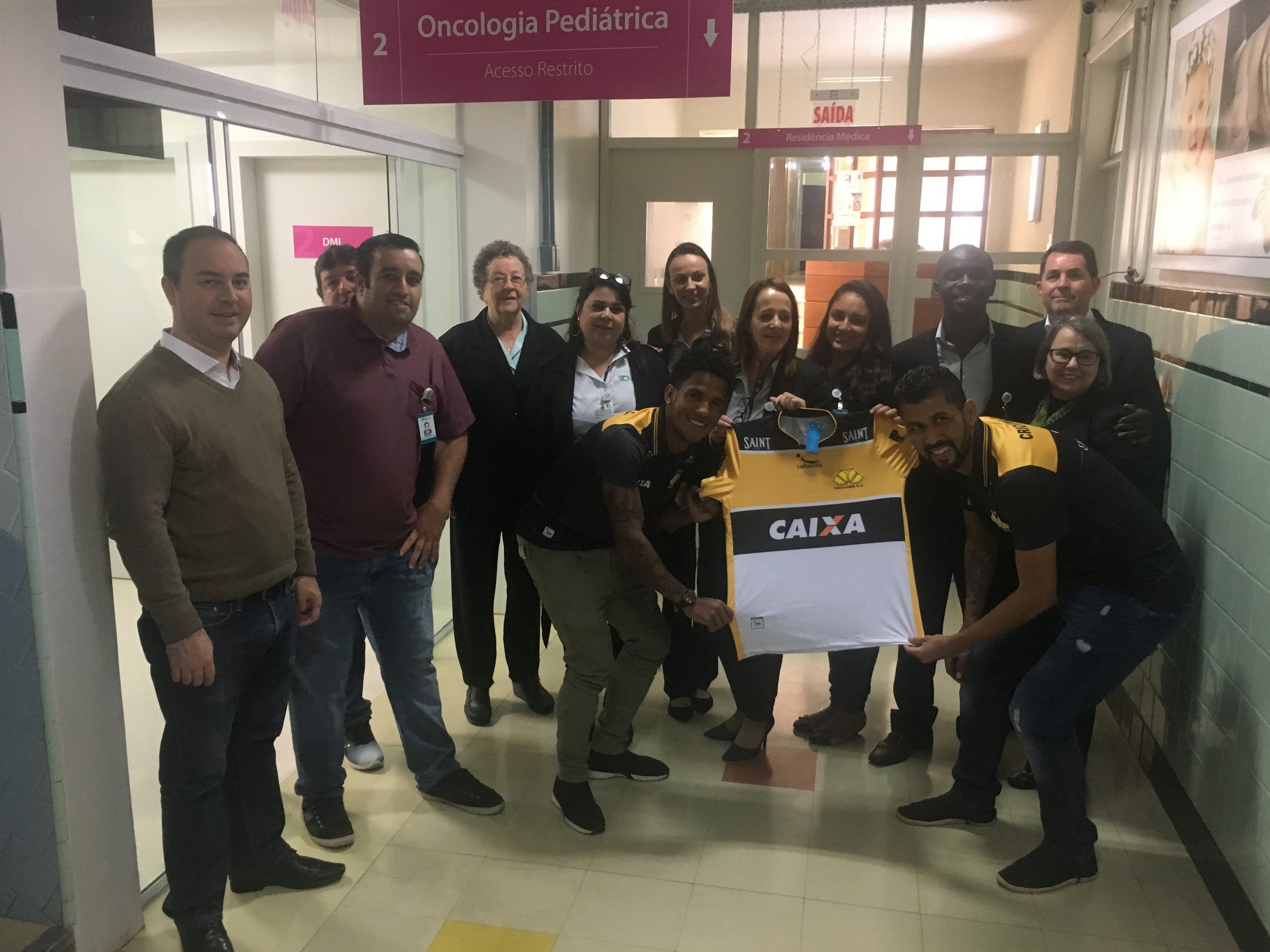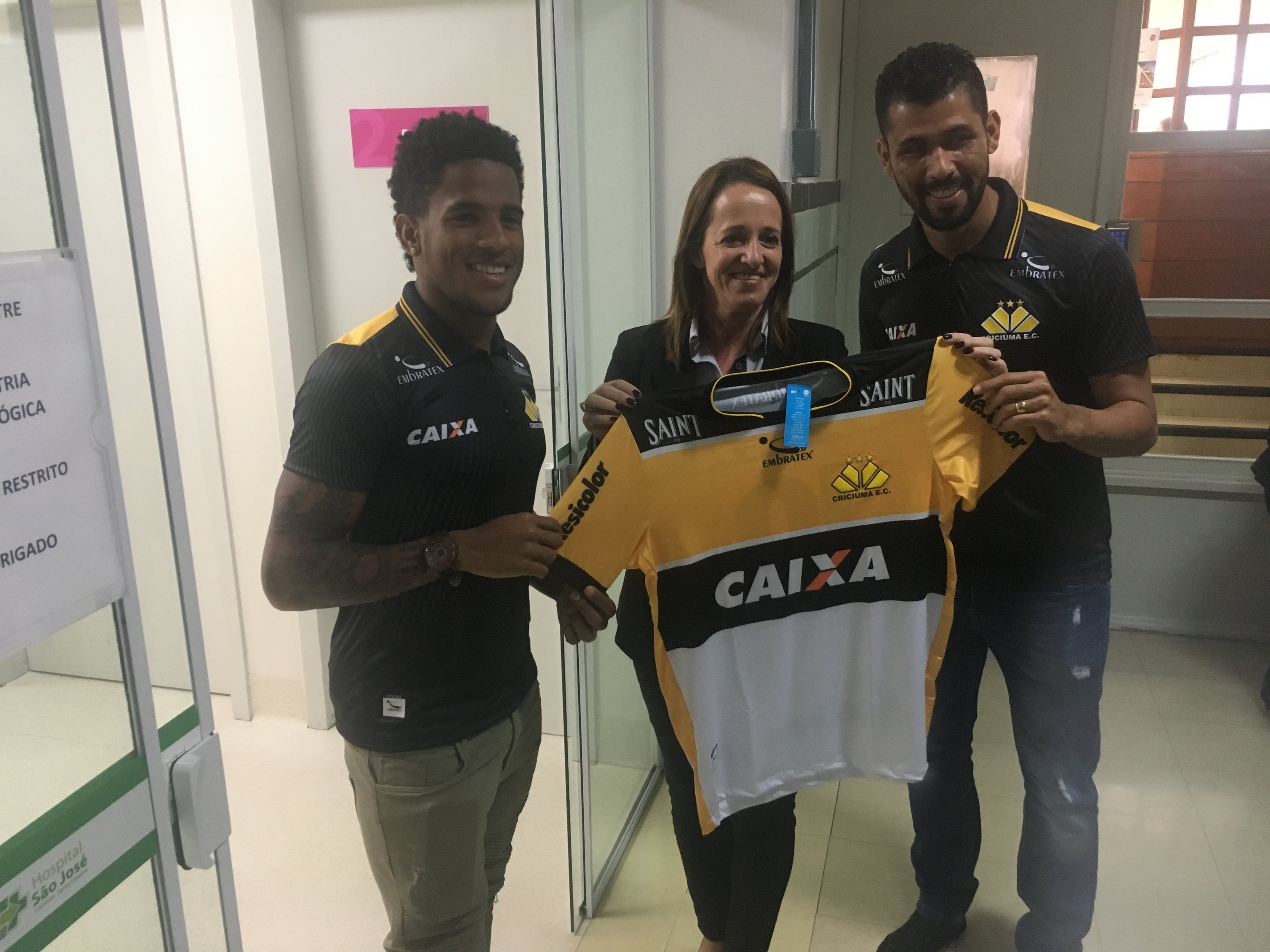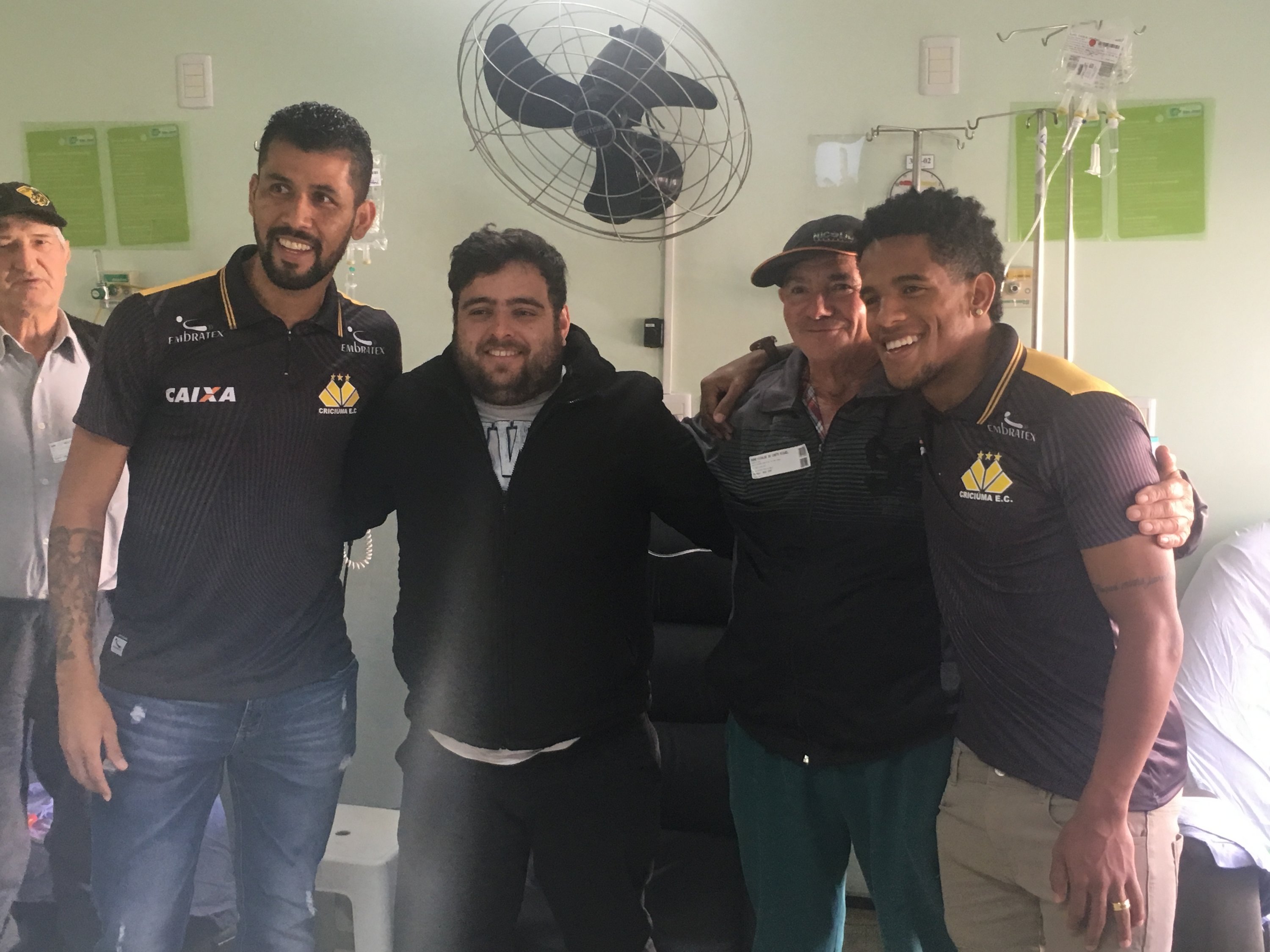 Legenda: Atacante Vitor Feijão e o lateral esquerdo Marlon visitaram o Hospital São José na manhã desta quinta-feira (14/09) Fotos: Fernando Ribeiro/www.criciuma.com.br Download