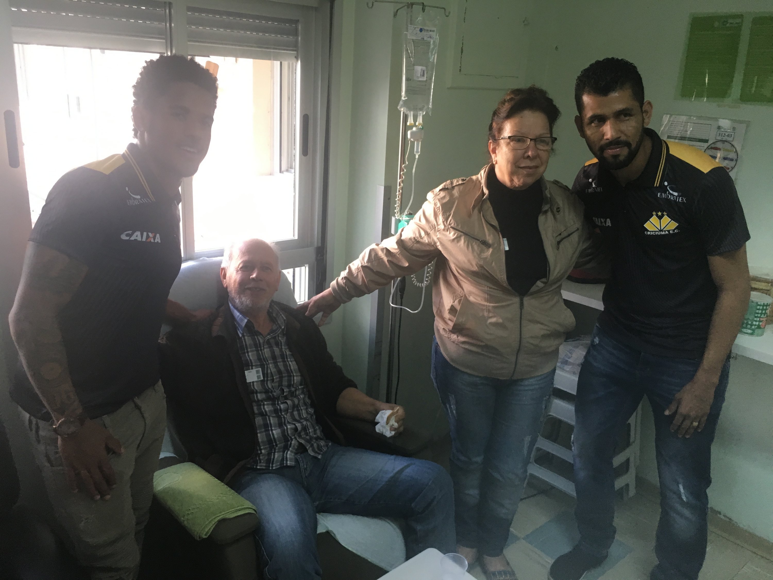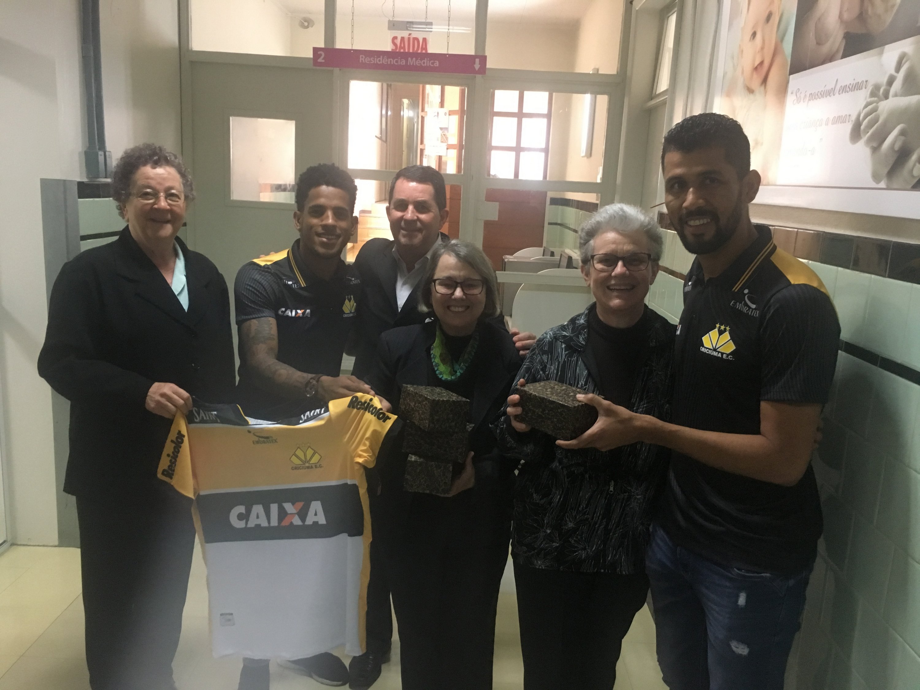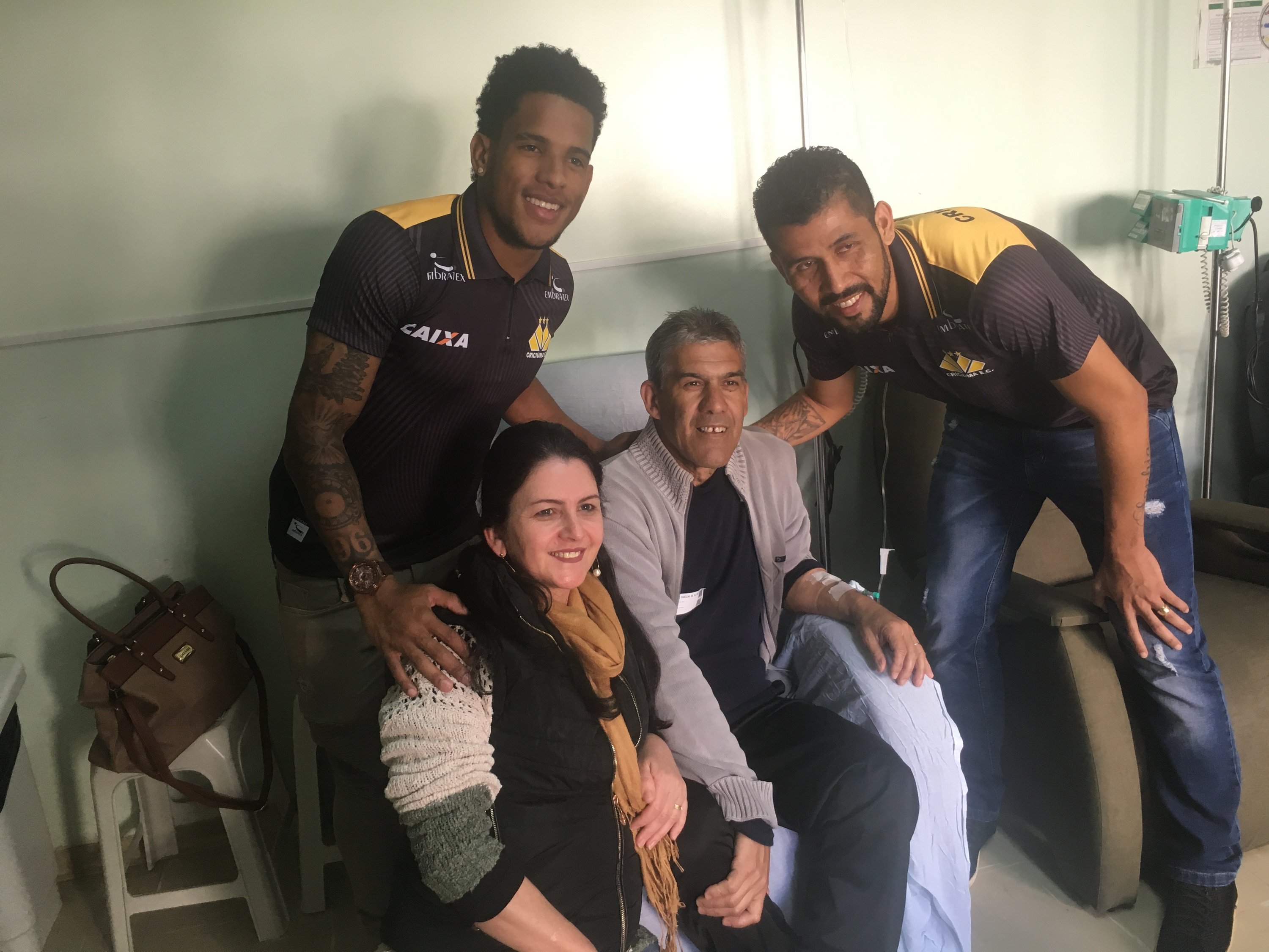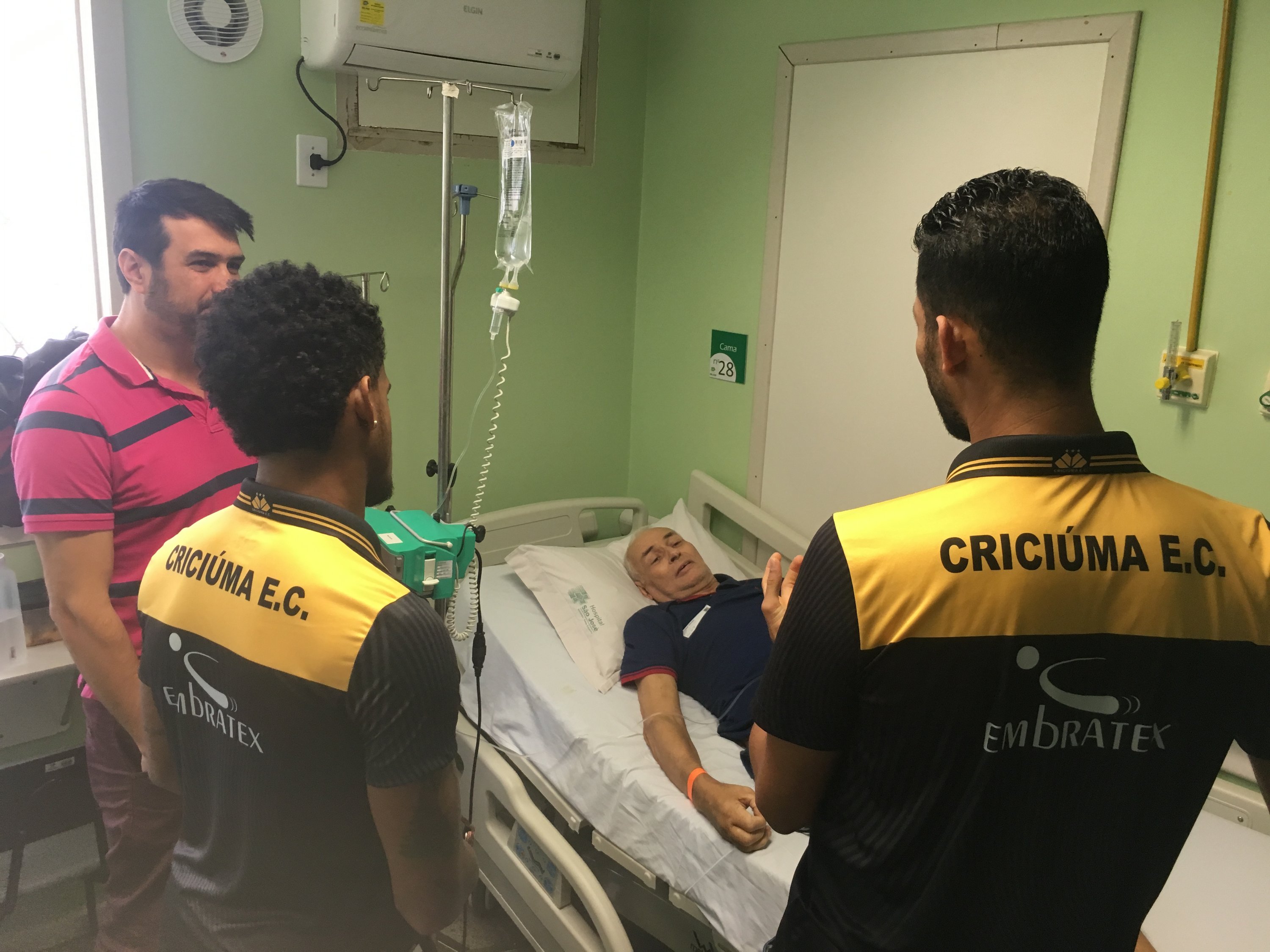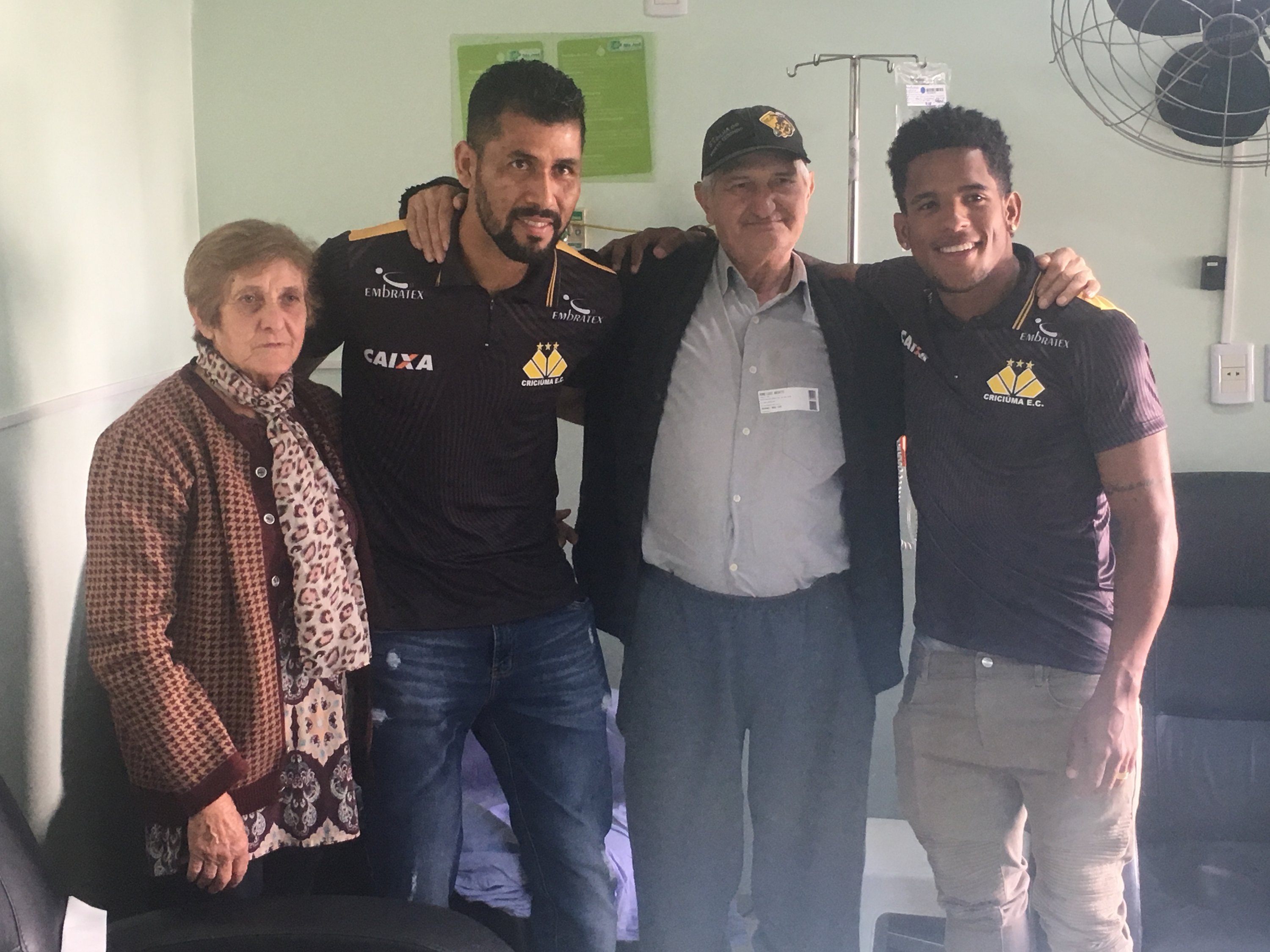 Legenda: Atacante Vitor Feijão e o lateral esquerdo Marlon visitaram o Hospital São José na manhã desta quinta-feira (14/09) Fotos: Fernando Ribeiro/www.criciuma.com.br Download