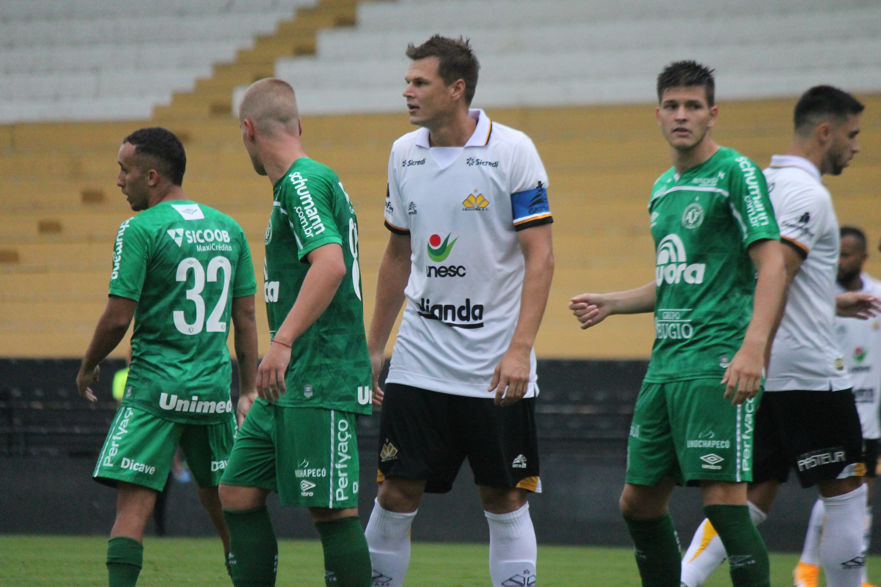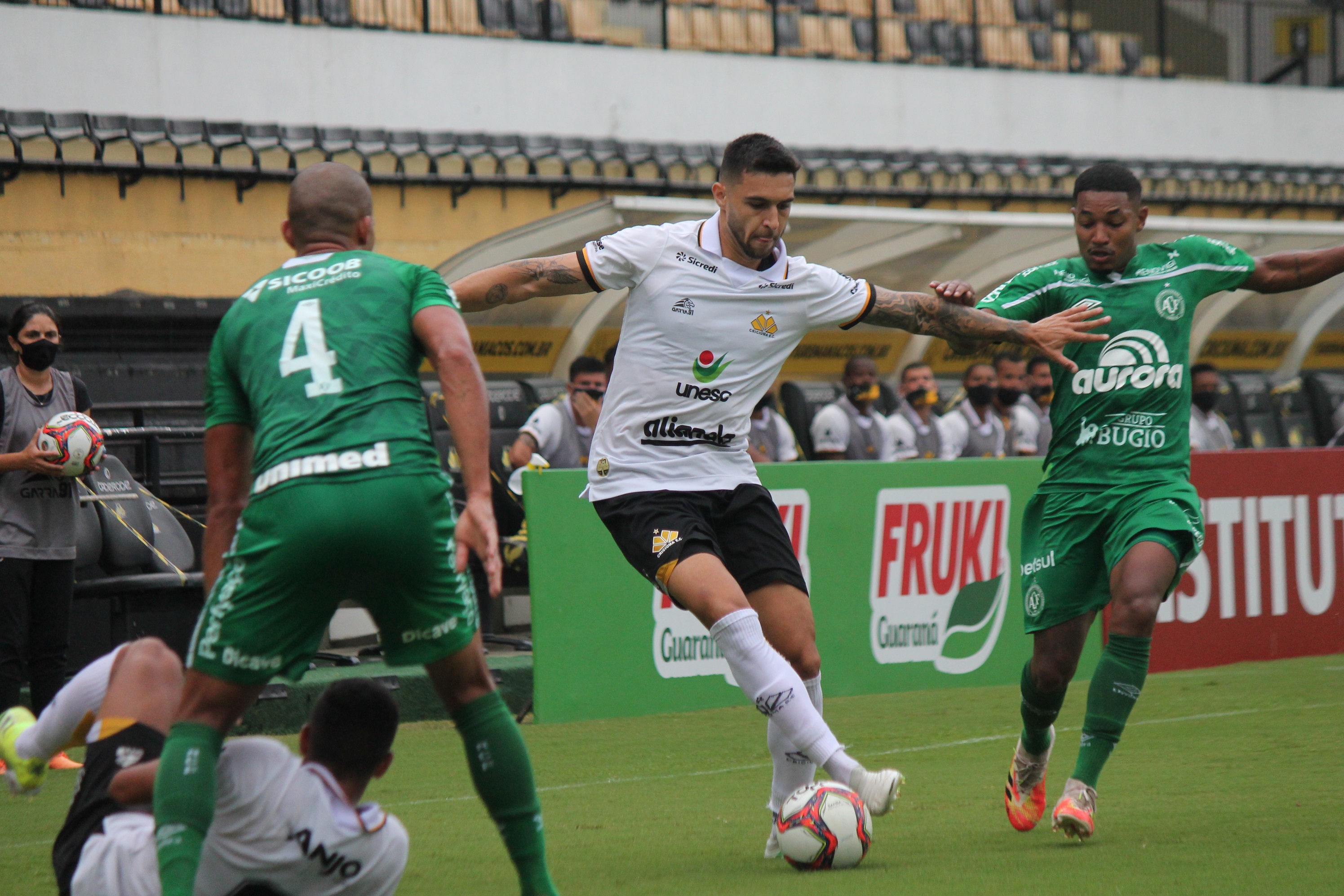 Legenda: Momentos do jogo entre Criciúma x Chapecoense na tarde deste domingo (14/03).