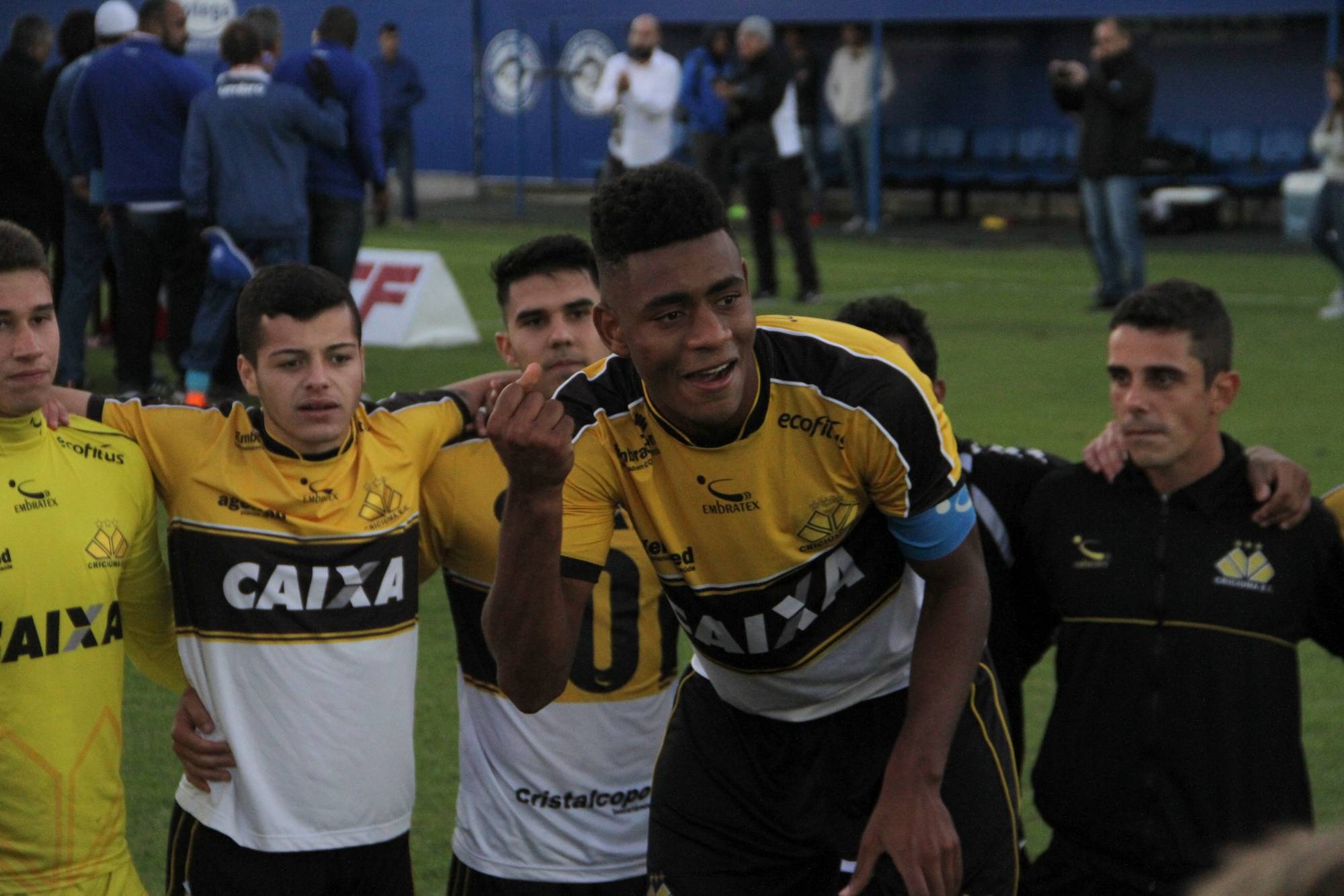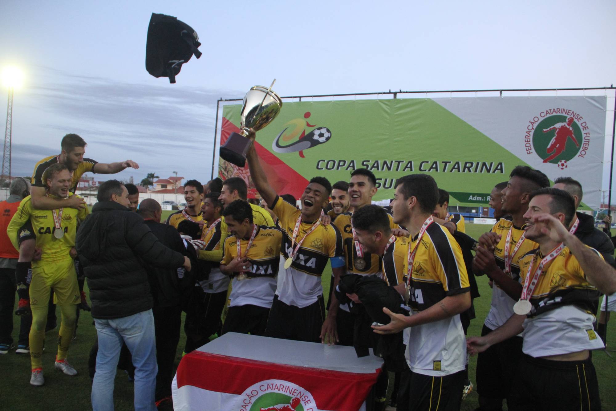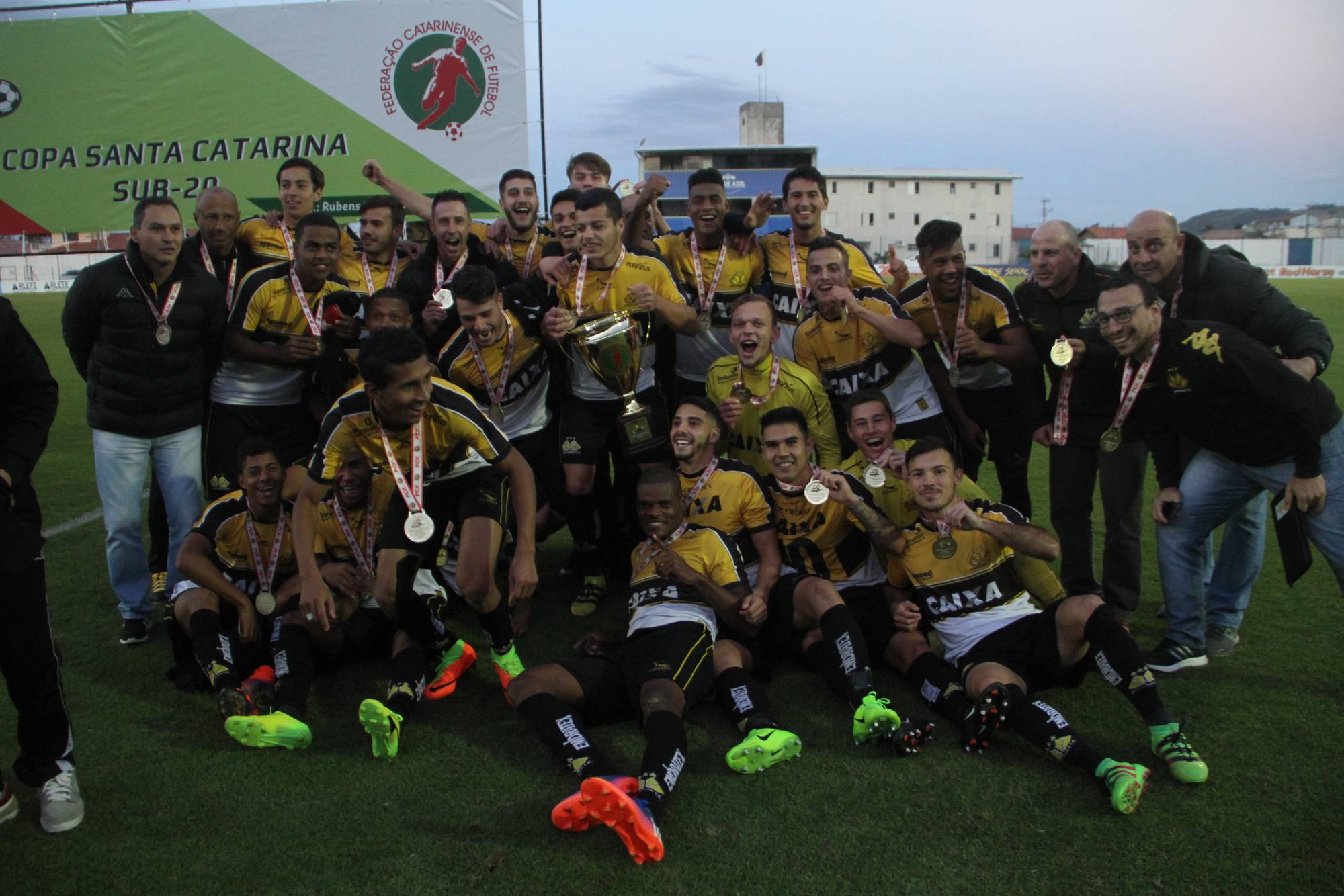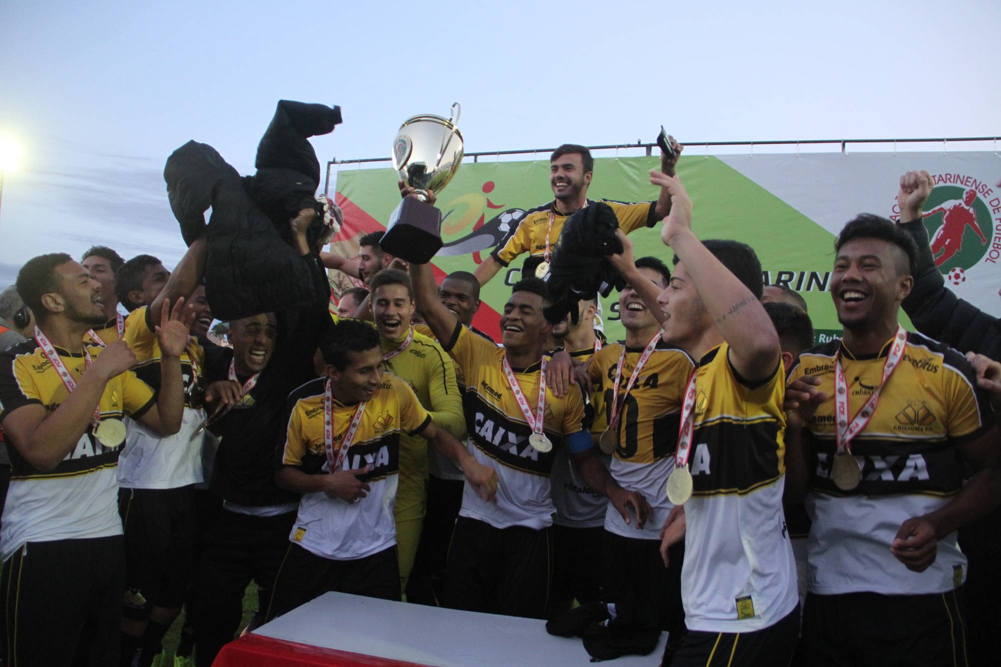 Legenda: Fotos da comemoração dos jogadores, comissão técnica e dirigentes do Criciúma após a partida Criciúma e Avaí, disputado na tarde deste sábado (01/07), no estádio Domingos Gonzales, em Tubarão, pela final da Copa Santa Catarina Sub-20 Fotos: Fernando Ribeiro/www.criciuma.com.br Download