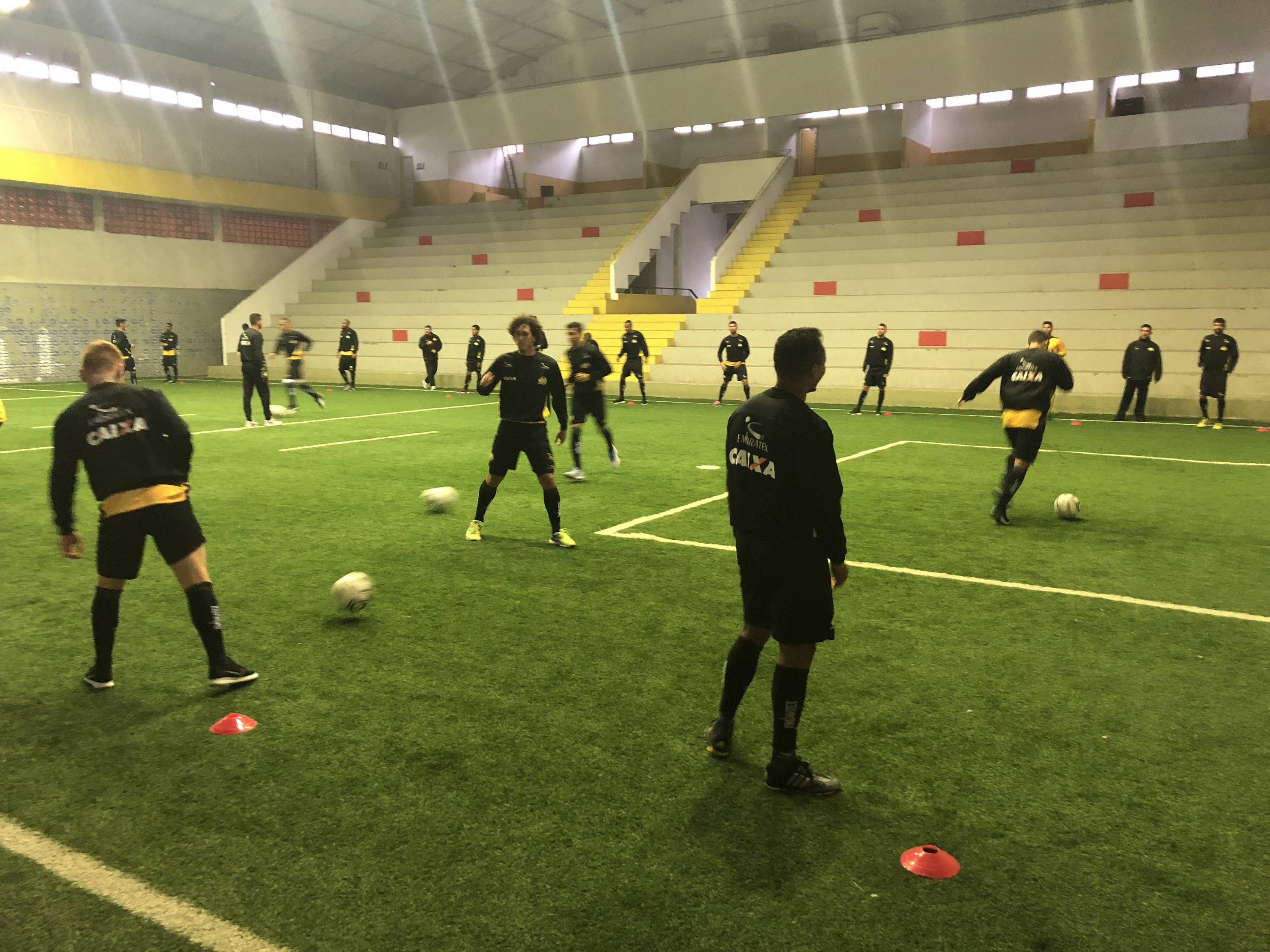 Legenda: Atletas do Criciúma durante treino no ginásio em anexo ao estádio Heriberto Hülse, na tarde desta quarta-feira (04/07)