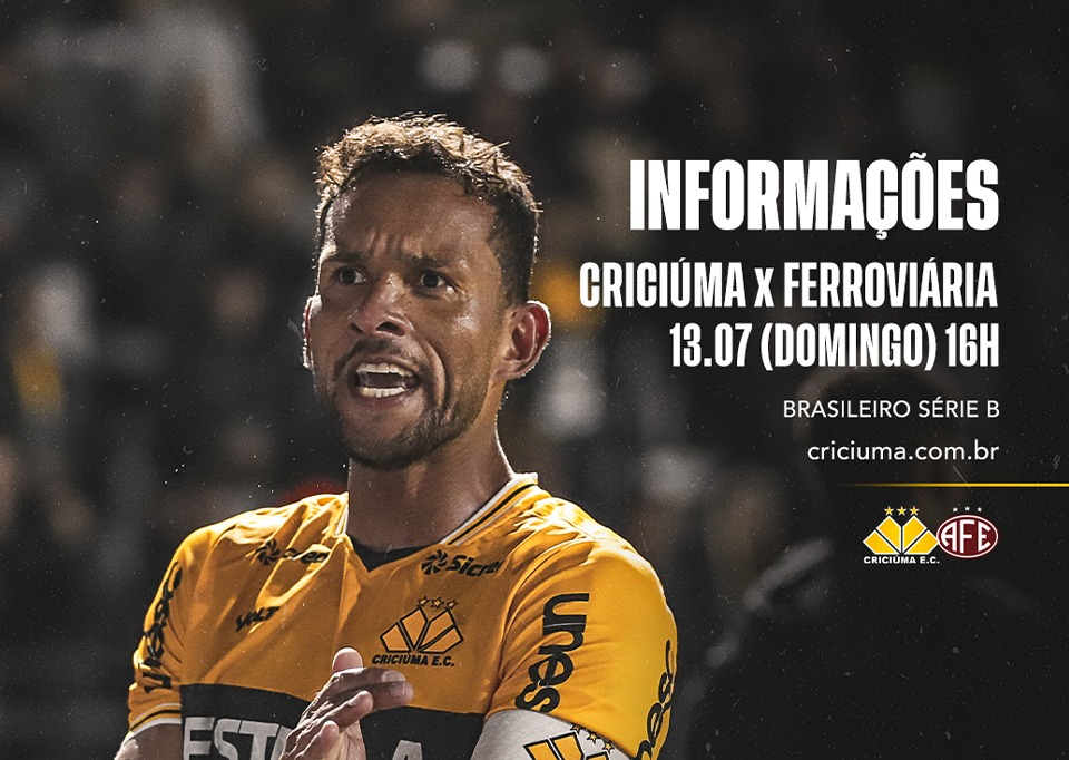 Neste domingo (13/07), o Criciúma enfrenta a Ferroviária pela 15ª rodada da Série B do Campeonato Brasileiro. A partida começará às 16h, com a abertura dos portões programada para às 14h. O ingresso de arquibancada inteiro custa R$100,00, enquanto a meia-entrada custa R$50,00 (válida para estudantes, pessoas com deficiência, idosos acima de 60 anos, entre outros, mediante comprovação conforme a legislação).