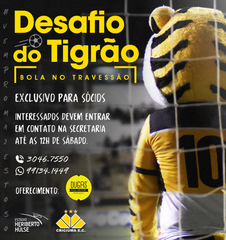 O mascote do Criciúma, o Tigrão, e a Pizzaria Dugas Delivery se uniram para desafiar o sócio torcedor. A brincadeira é acertar a bola no travessão durante o intervalo de jogo entre Criciúma e Brusque, neste domingo (01/03).