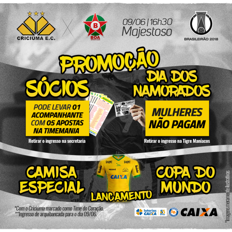 O sócio em dia também poderá retirar 01 ingresso de arquibancada com 05 apostas na Timemania marcando o Criciúma como time do coração nos concursos 1189 e 1190. O ingresso é retirado na secretaria.