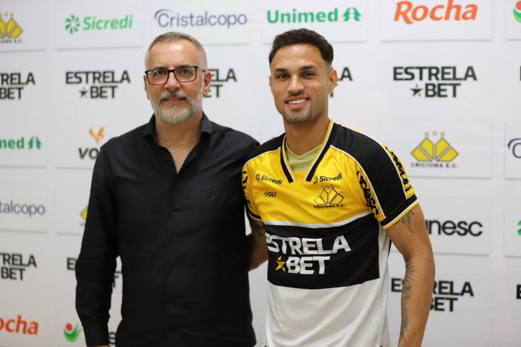 Executivo de futebol do Tigre, Juliano Camargo, e o atacante Serginho. Foto: Celso da Luz/ Assessoria de imprensa Criciúma E.C.