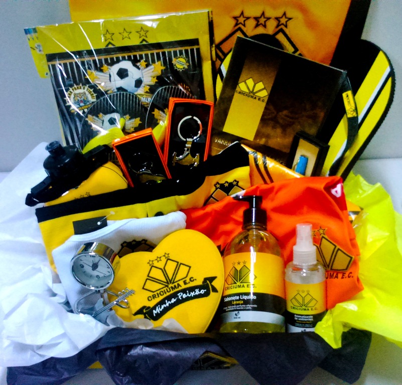 O kit sorteado conta uma camisa oficial de goleiro, caneta metal azul, um relógio guitarra, uma sabonete líquida, um aromatizante, cantil infantil 450ml, kit torcedor mirim (sandália, quebra cabeça e revista para colorir), uma caixa coração bordado pequeno, dois chaveiros metal, um DVD da trajetória do Criciúma na Copa do Brasil de 1991, avental, regata infantil, uma camisa gola pólo e um par de sandálias.