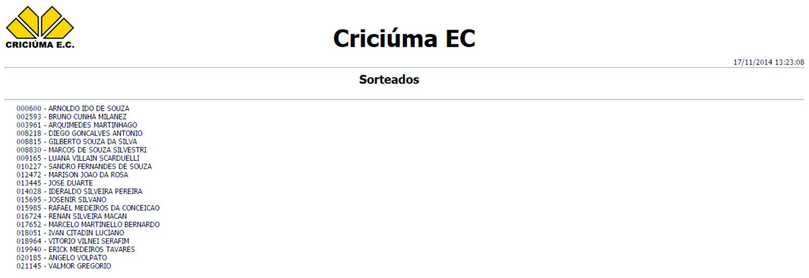 O Criciúma sorteou na tarde desta segunda-feira (17/11) 20 ingressos de arquibancada entre os sócios em dia. O sorteio ocorreu através de um sistema automático. As entradas são para o jogo desta quarta-feira (19/11) contra o Bahia, às 21 horas, no estádio Heriberto Hülse.
