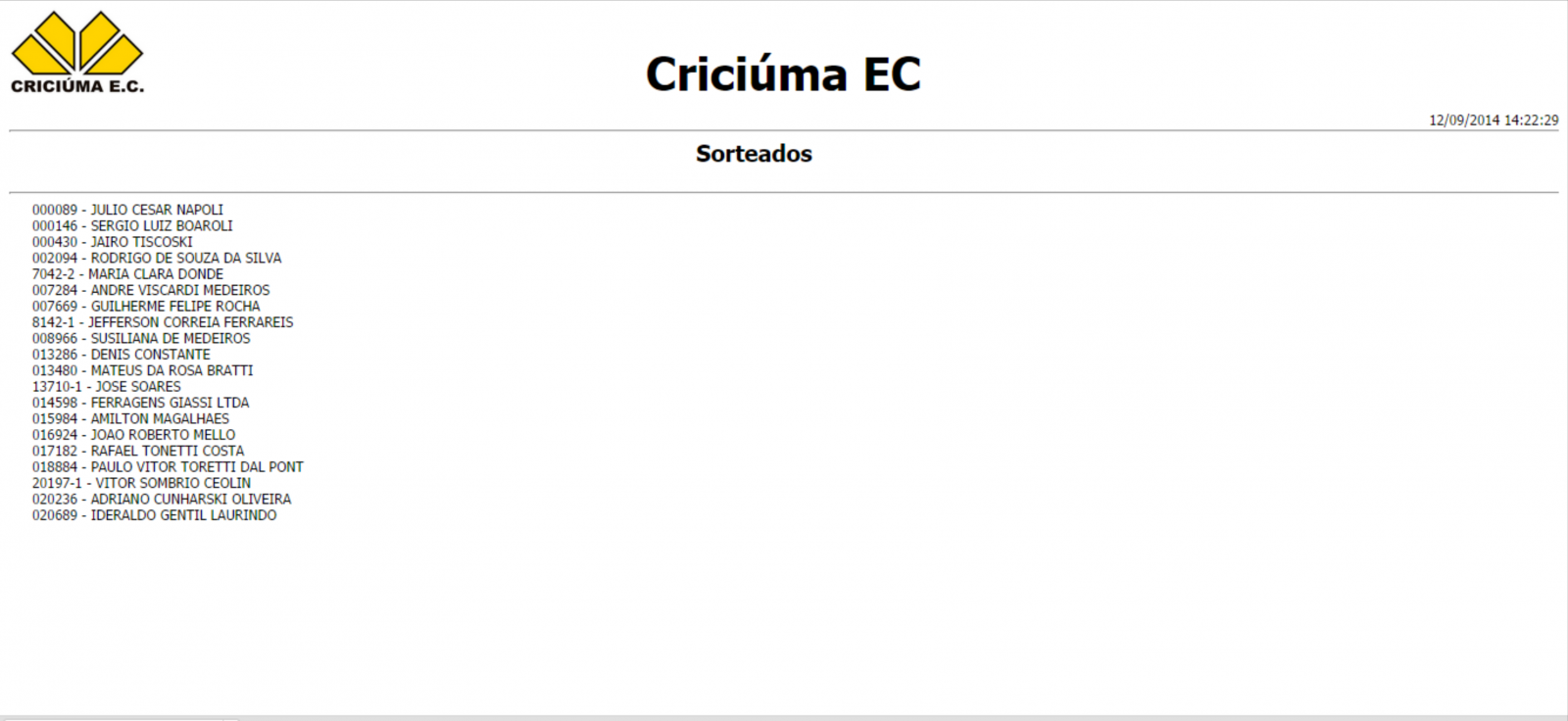 O Criciúma sorteou nesta sexta-feira (12/09) 20 ingressos de arquibancada para os sócios em dia. As entradas são para o jogo de domingo (14/09) contra o Goiás, às 18h30min, no estádio Heriberto Hülse. O sorteio ocorreu através de um sistema automático.