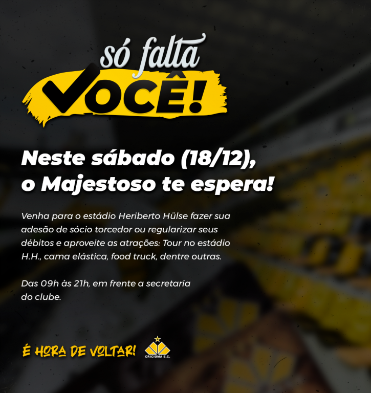 Neste sábado, 18 de dezembro, o Criciúma Esporte Clube realizará um evento que tem como objetivo trazer os seus torcedores para um dia especial no estádio Heriberto Hulse. Na ocasião a secretaria do clube estará aberta em horário especial, das 09h às 19h, para atendimento ao torcedor que deseja associar-se e também para que os sócios que possuem alguma pendência financeira com o clube possam colocar em dia suas mensalidades. Além disso, estão sendo preparadas atividades como tour no estádio, cama elástica, food truck, entre outras atrações para o torcedor.