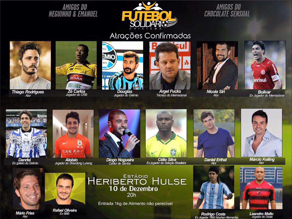 O Futebol Solidário reunirá artistas, jogadores de equipes do país, ídolos que fizeram história em clubes de futebol. Entre os confirmados, estão os atores Thiago Rodrigues, Daniel Erthal e Mário Frias, o cantor Diego Nogueira, e os jogadores Zé Carlos, Aloísio e Douglas. O ex-goleiro do Grêmio, Danrlei, e o ex-zagueiro do Internacional, Bolívar, também estarão presentes.