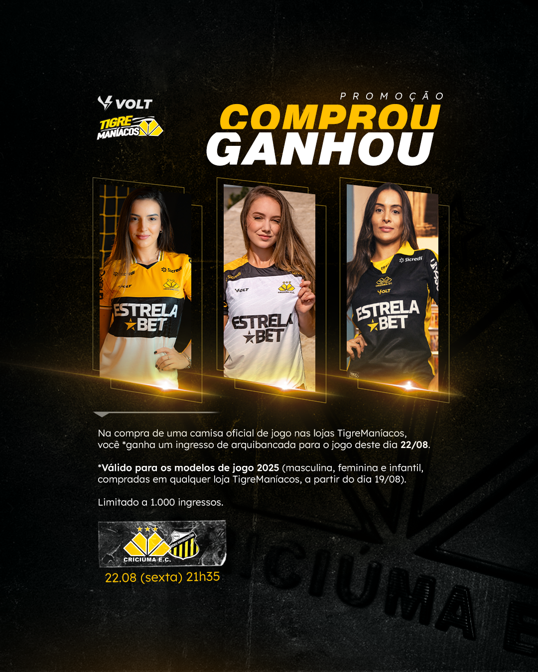 A ação é válida em todas as lojas Tigre Maníacos: no Nações Shopping, no Criciúma Shopping, na unidade do Estádio Heriberto Hülse e na loja virtual tigremaniacos.com.br.