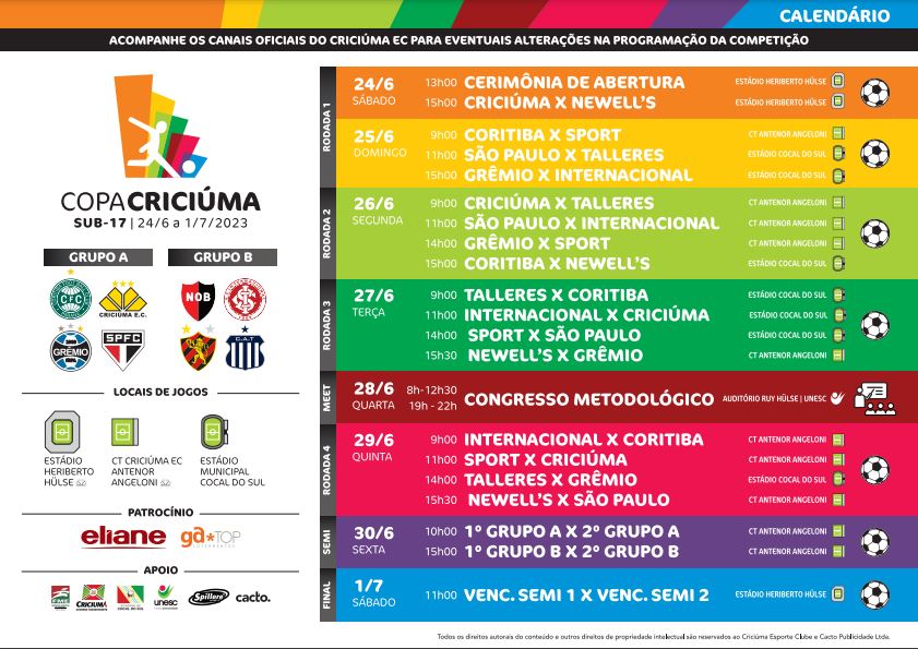 Na liderança do Catarinense com 14 pontos, o Criciúma segue invicto com 4 vitórias e dois empates. “Estamos com uma boa pontuação e fazendo bons jogos no estadual, que voltaremos a jogar somente em julho. Portanto, é hora de focar somente na disputa da Copa Criciúma, em especial, na nossa estreia. Receberemos grandes clubes, sabemos da dificuldade dos jogos e estamos certos do nosso objetivo primário, que é a classificação para as semifinais”, destacou o técnico Roberto Volpato.