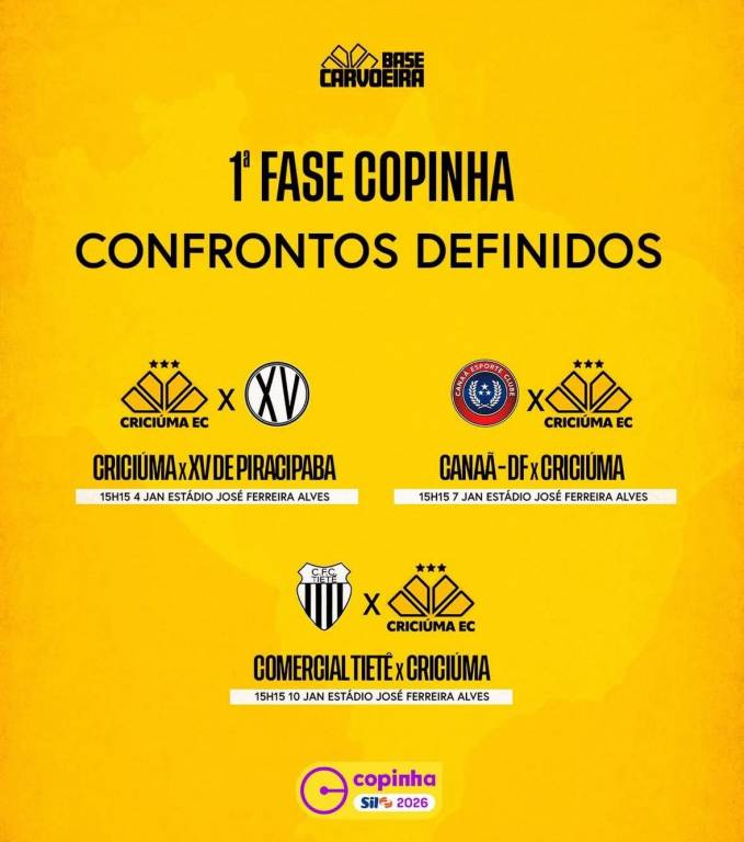 O Criciúma, atual tricampeão catarinense e terceiro colocado na última edição da Copinha, estará no Grupo 18 e terá a sua estreia contra o XV de Piracicaba no domingo (04/01), às 15h15min. O segundo confronto do Tigre será contra o Canaã no dia 7 de janeiro. Os carvoeiros fecham a primeira fase enfrentando os donos da casa, o Comercial Tietê, no dia 10. Todos os jogos serão disputados no estádio José Ferreira Alves e as transmissões ocorrem na FPF TV, Cazé TV ou Sportv.