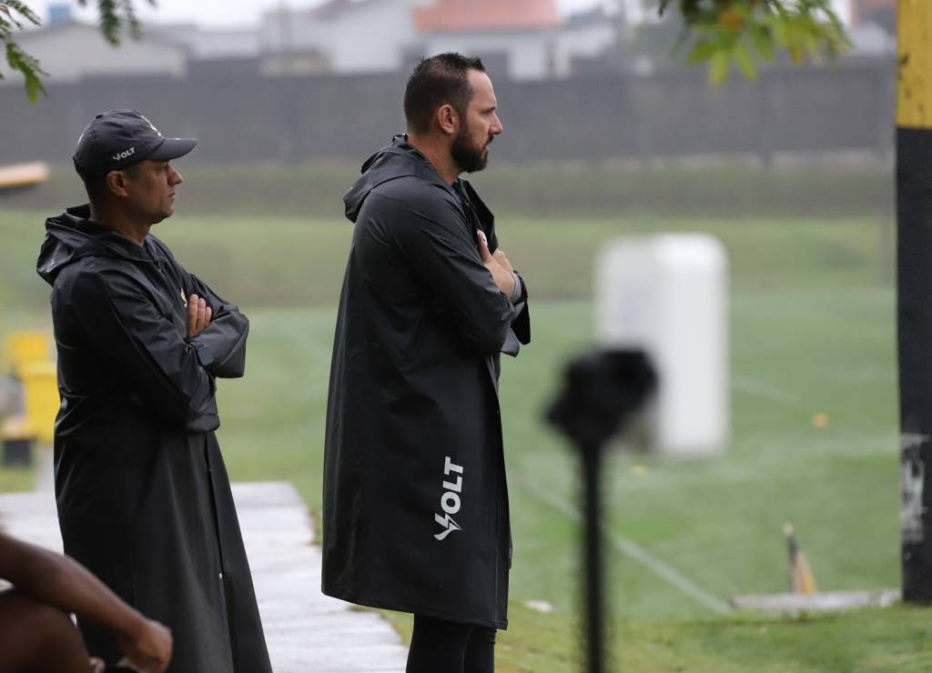 Roberto Volpato e o auxiliar técnico Serraninho. Foto: Celso da Luz/ Assessoria de imprensa Criciúma E.C.