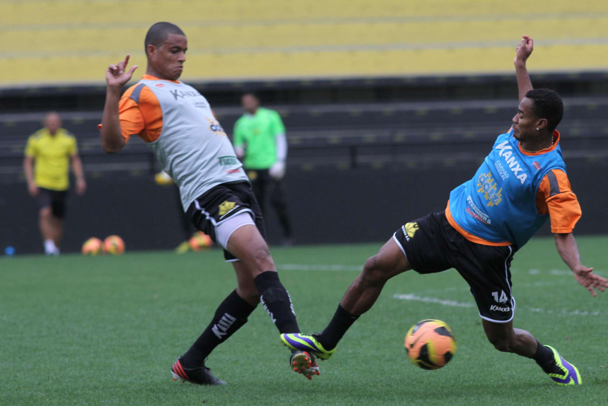 Legenda: Zagueiro Joílson e atacante Lins durante treino na tarde desta sexta-feira (29/11) no estádio Heriberto Hülse