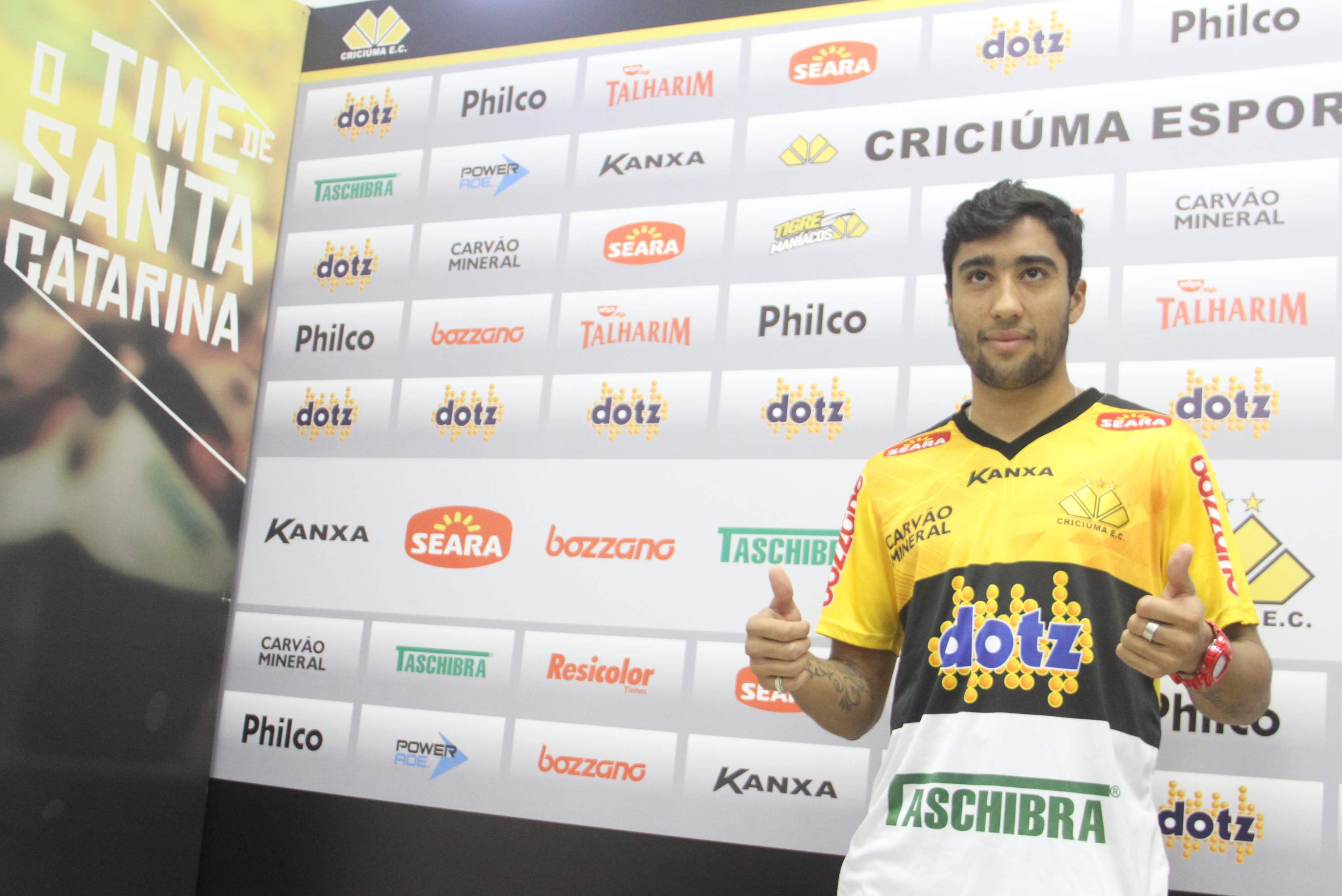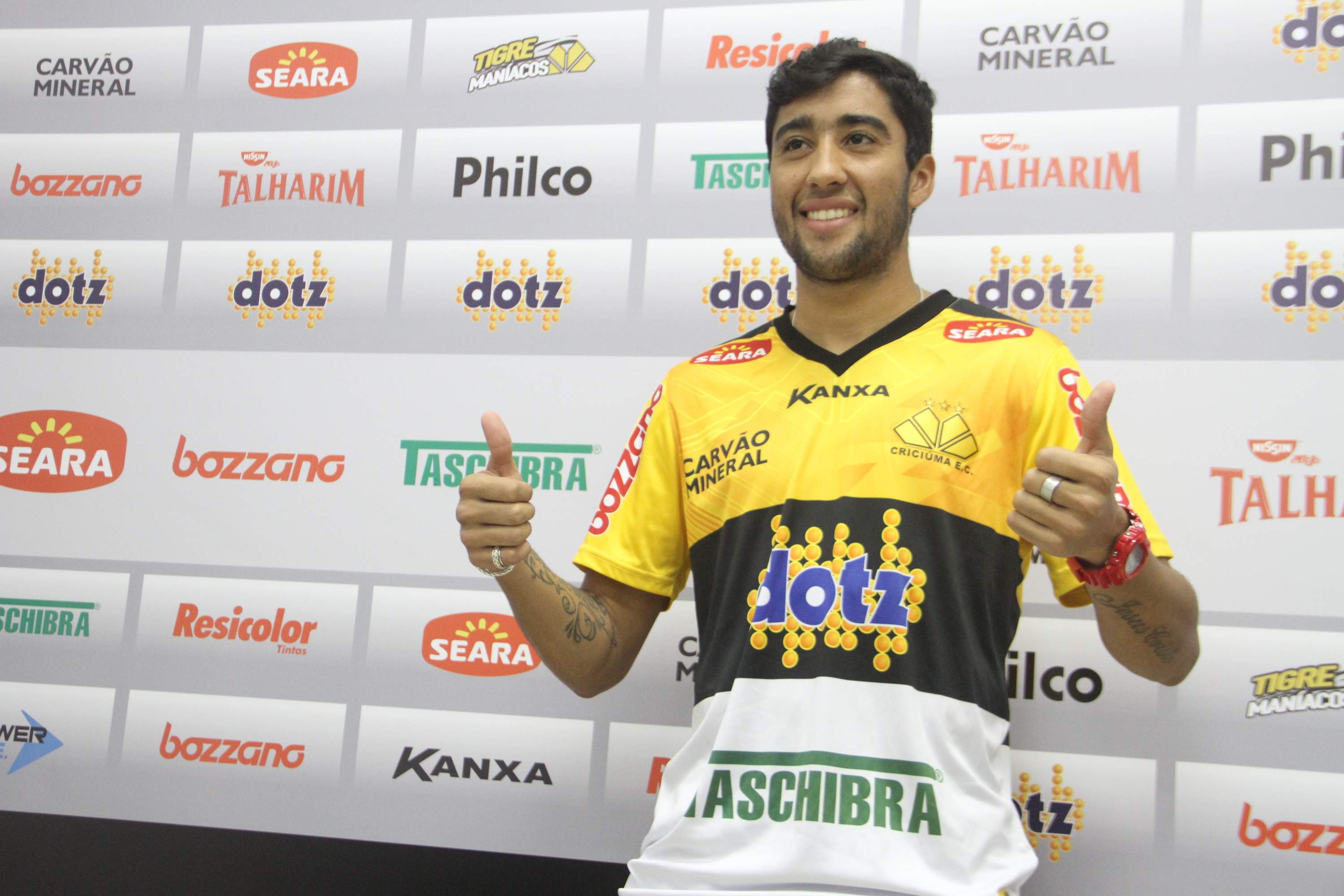 Legenda: Atacante Maurinho foi apresentado oficialmente pelo Criciúma na manhã desta sexta-feira (23/05) na Sala de Imprensa Clésio Búrigo, no estádio Heriberto Hülse