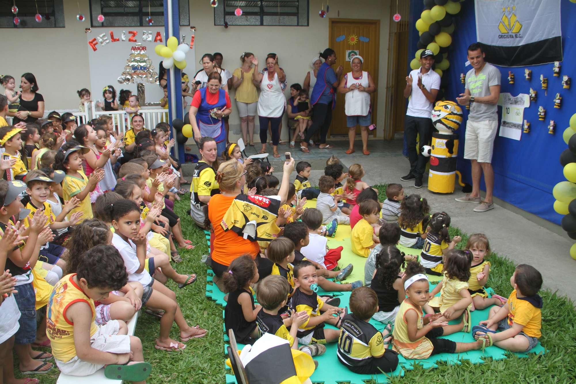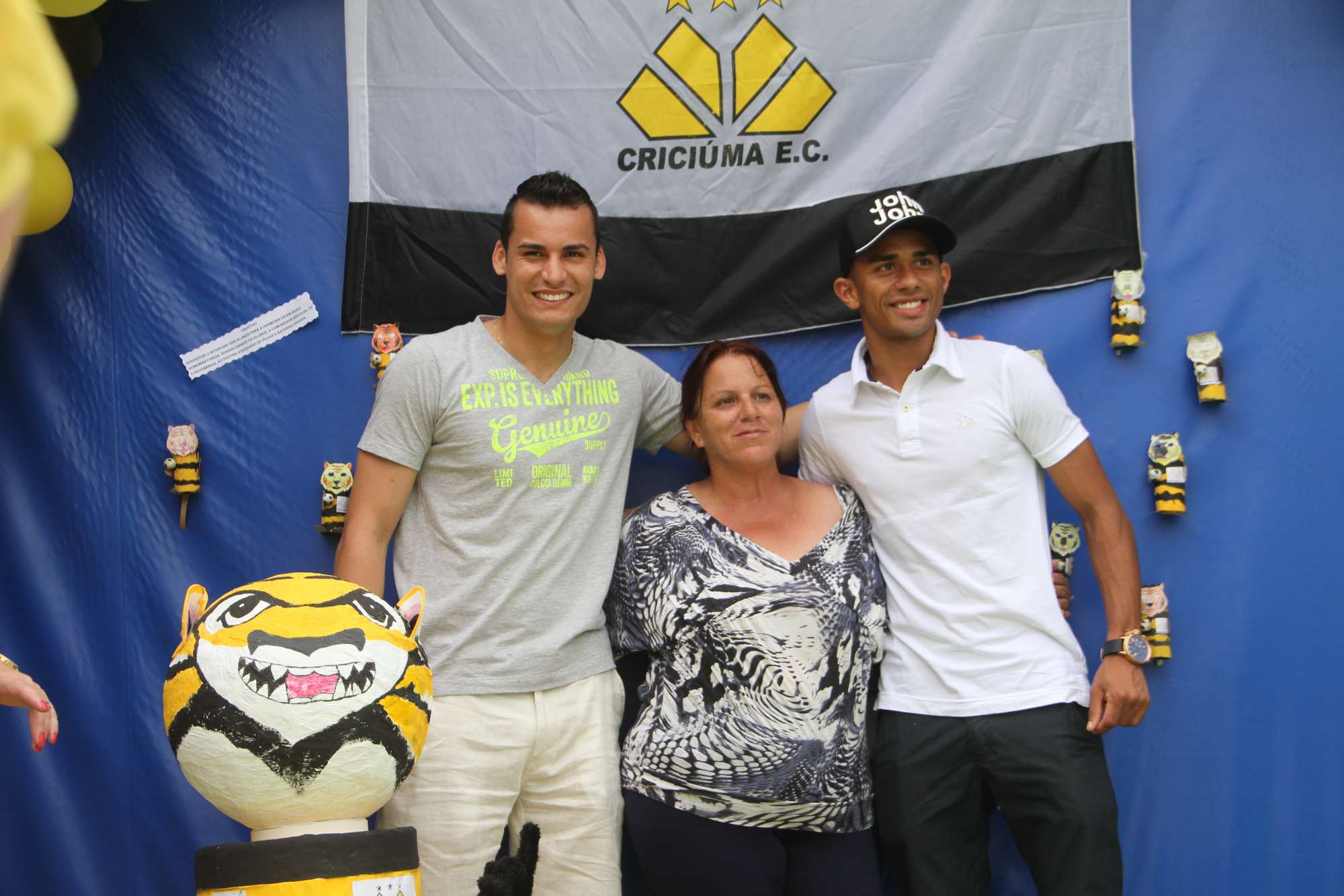Legenda: O goleiro Bruno e o lateral direito Sueliton participaram do lançamento oficial do 'Papa Pilha do Tigrão' no Centro de Educação Infantil Afasc Santa Luzia na manhã desta quinta-feira (28/11), em Criciúma