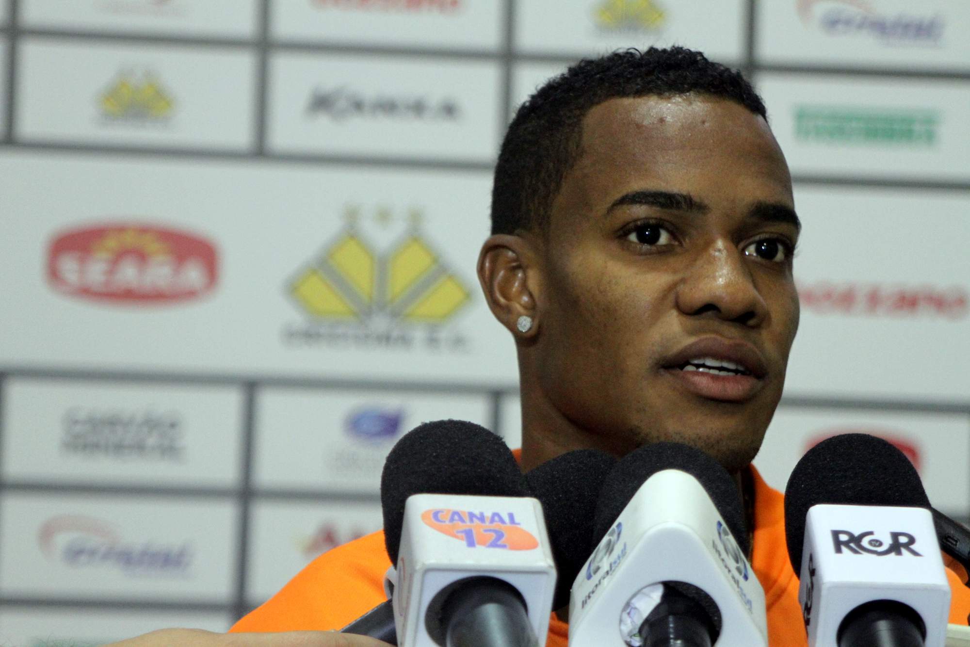 Legenda: Atacante Lins concede entrevista na sala de imprensa do estádio Heriberto Hülse nesta segunda-feira (15/04)