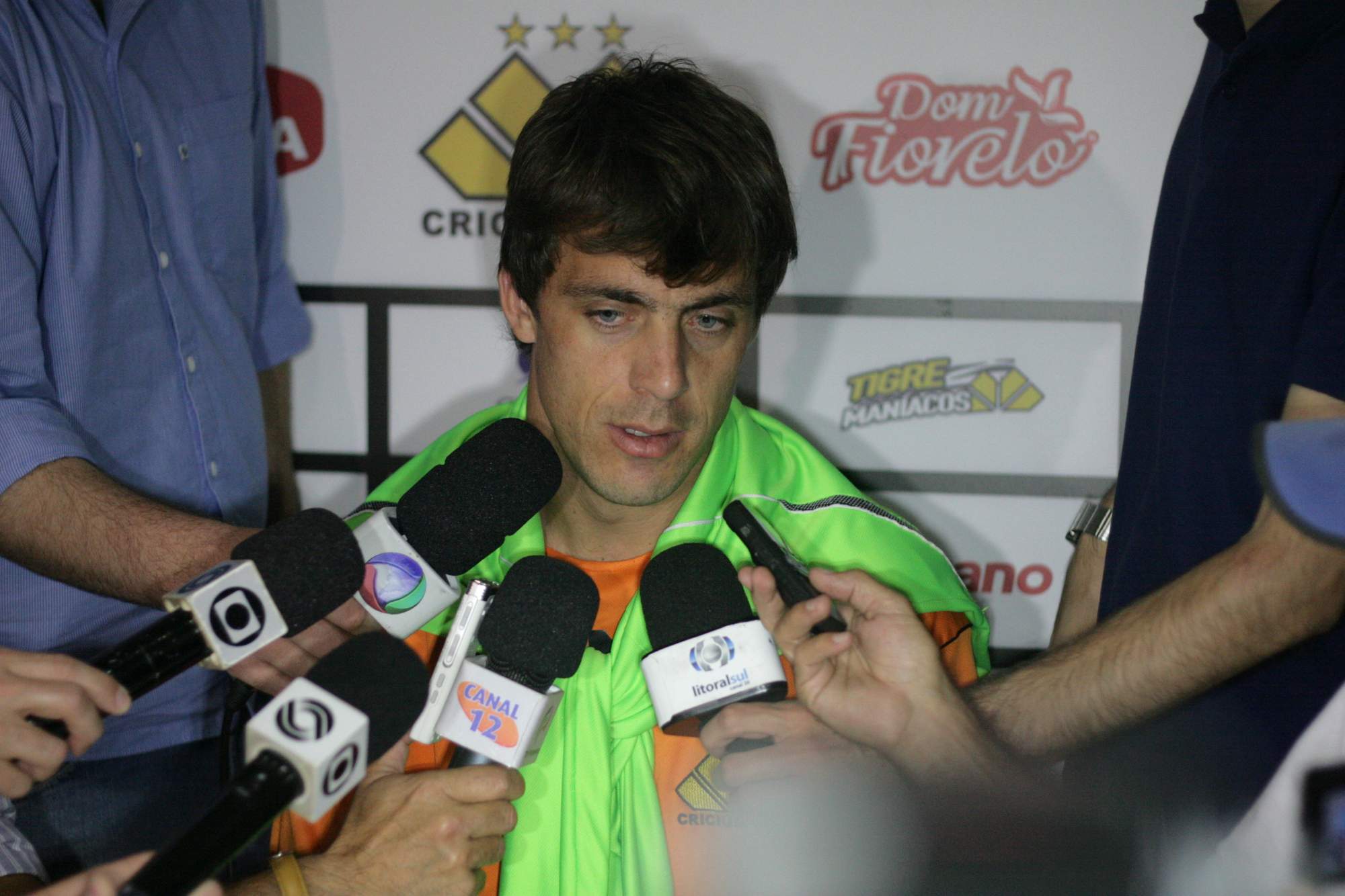 Legenda: Entrevista coletiva com o goleiro Michel Alves, na tarde desta quinta-feira (22/11), na sala de imprensa do estádio Heriberto Hülse
