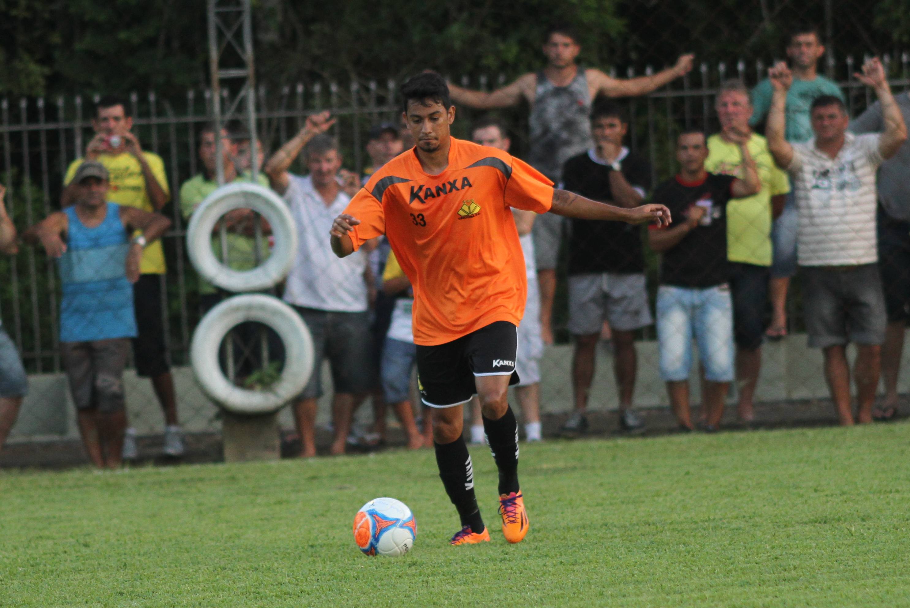 Legenda: Atacante Lulinha durante vitória do Criciúma contra combinado de atletas amadores da região no campo da Cersul, em Turvo, na noite desta terça-feira (21/01)