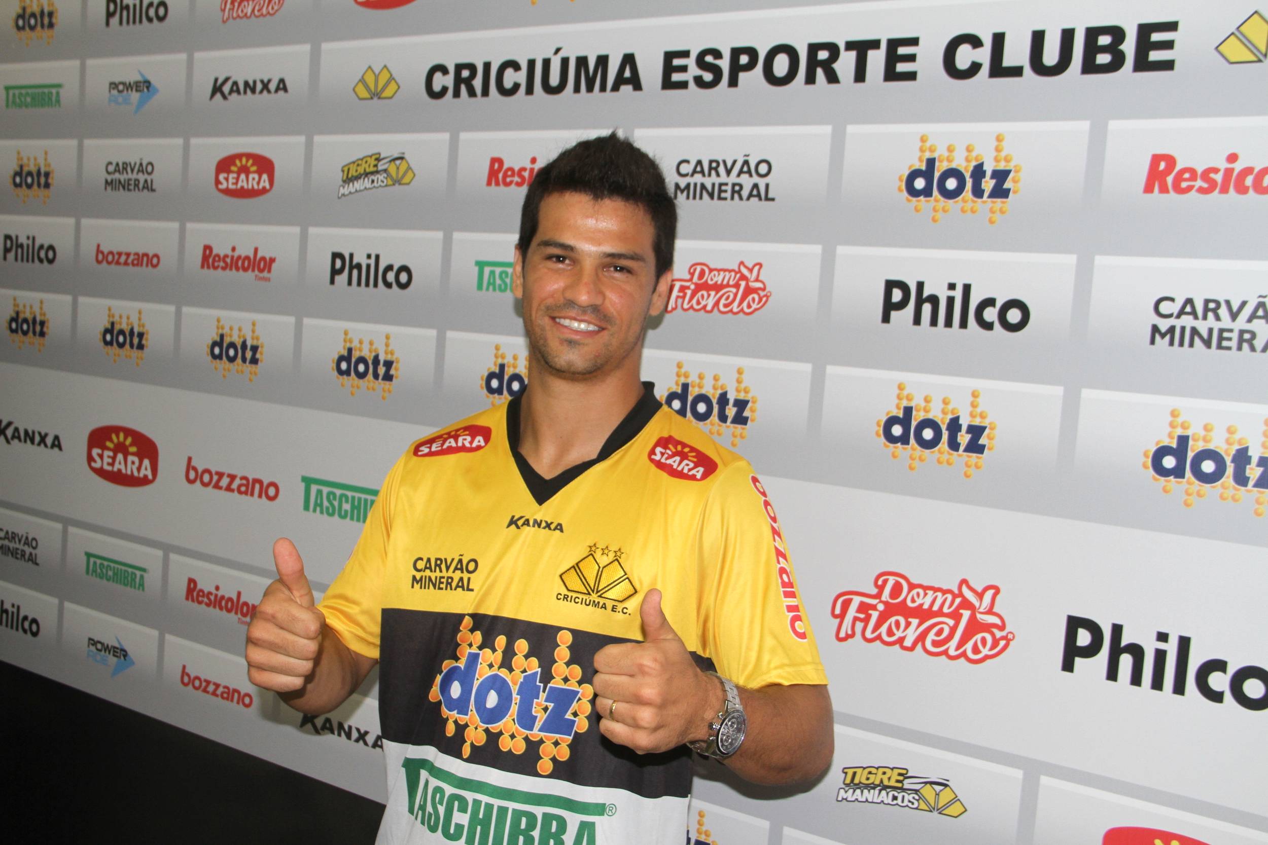 Legenda: Lateral esquerdo Rogério foi apresentado como reforço do Criciúma na tarde desta terça-feira (14/01) na Sala de Imprensa Clésio Búrigo