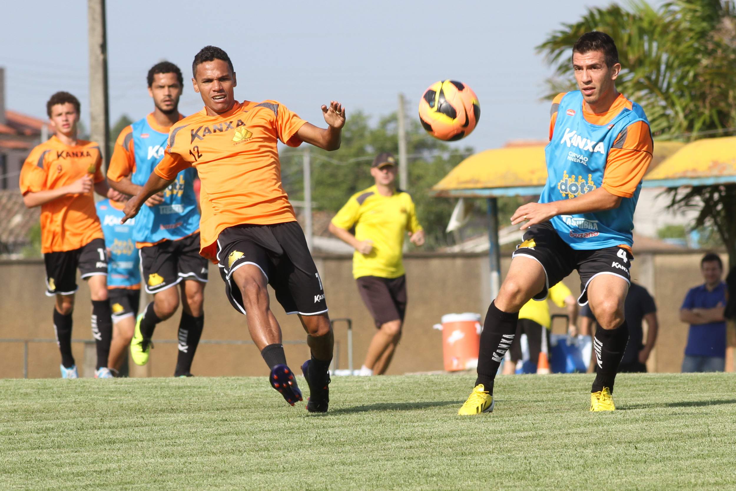 Legenda: Atacante Fabinho e meia Ricardinho durante treino do Criciúma na tarde desta quarta-feira (30/10) no Centro de Treinamento, no bairro Cristo Redentor