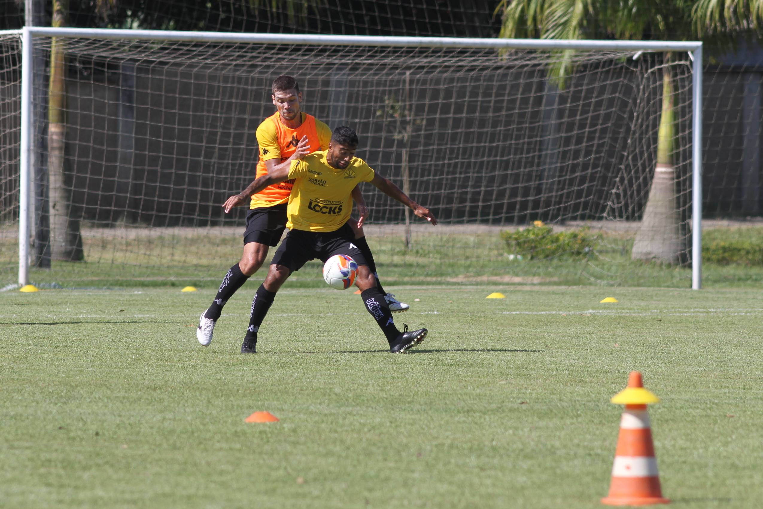 Legenda: Barreto e Douglas Moreira durante treino do Criciúma na manhã deste sábado (23/01), no Centro de Treinamento, no bairro Cristo Redentor