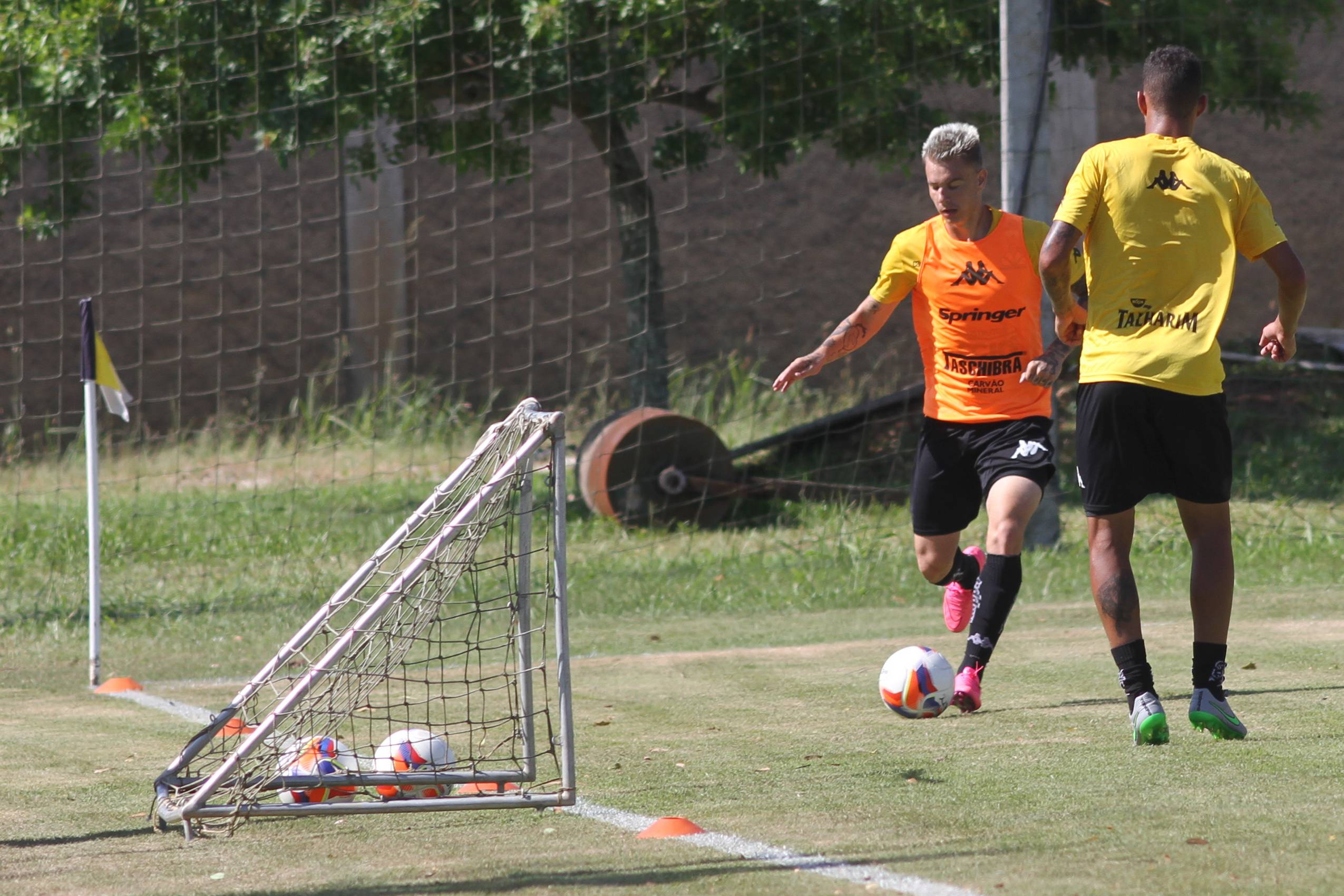 Legenda: Diego Giaretta e Maurinho durante treino do Criciúma na manhã deste sábado (23/01), no Centro de Treinamento, no bairro Cristo Redentor