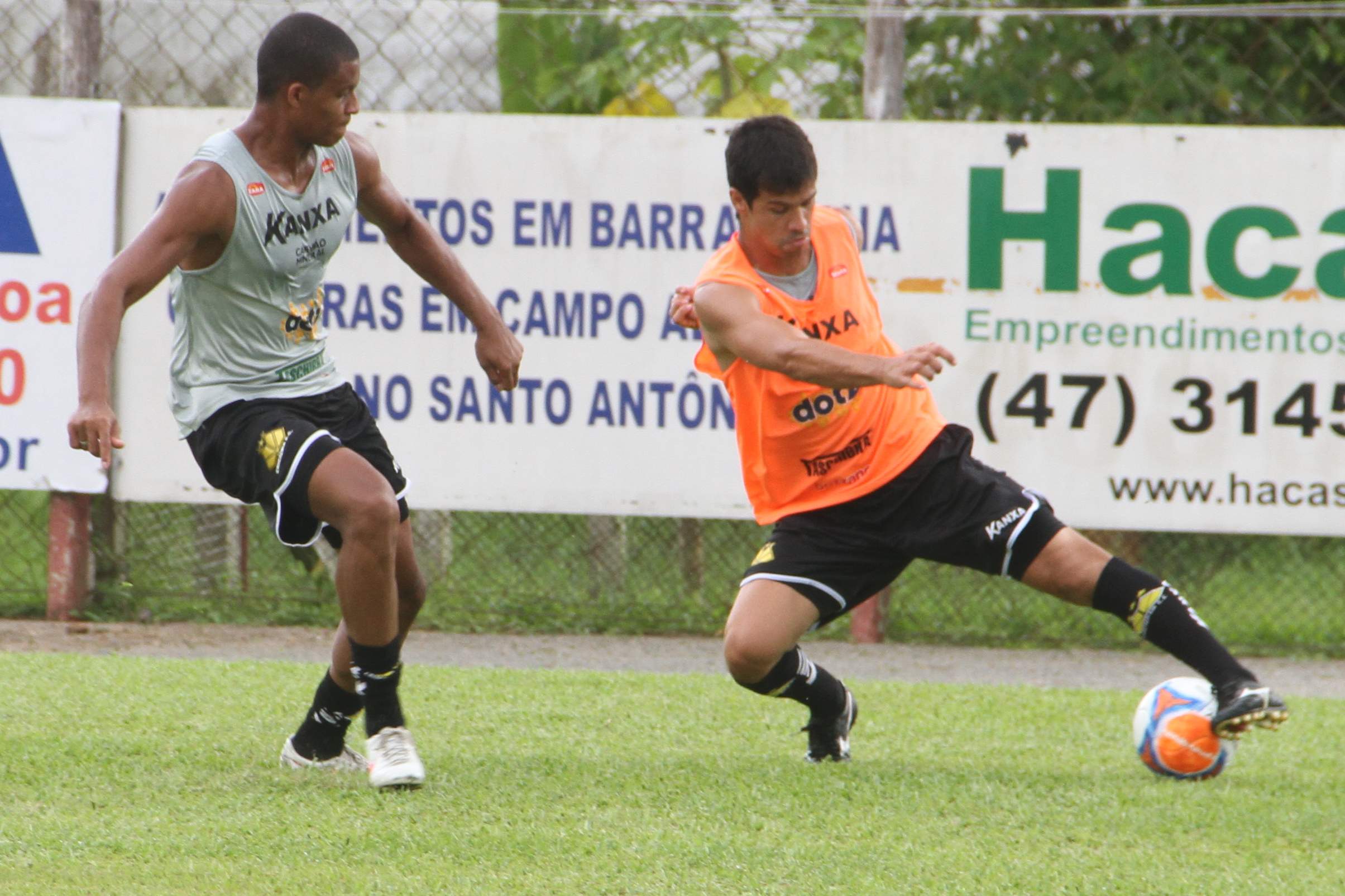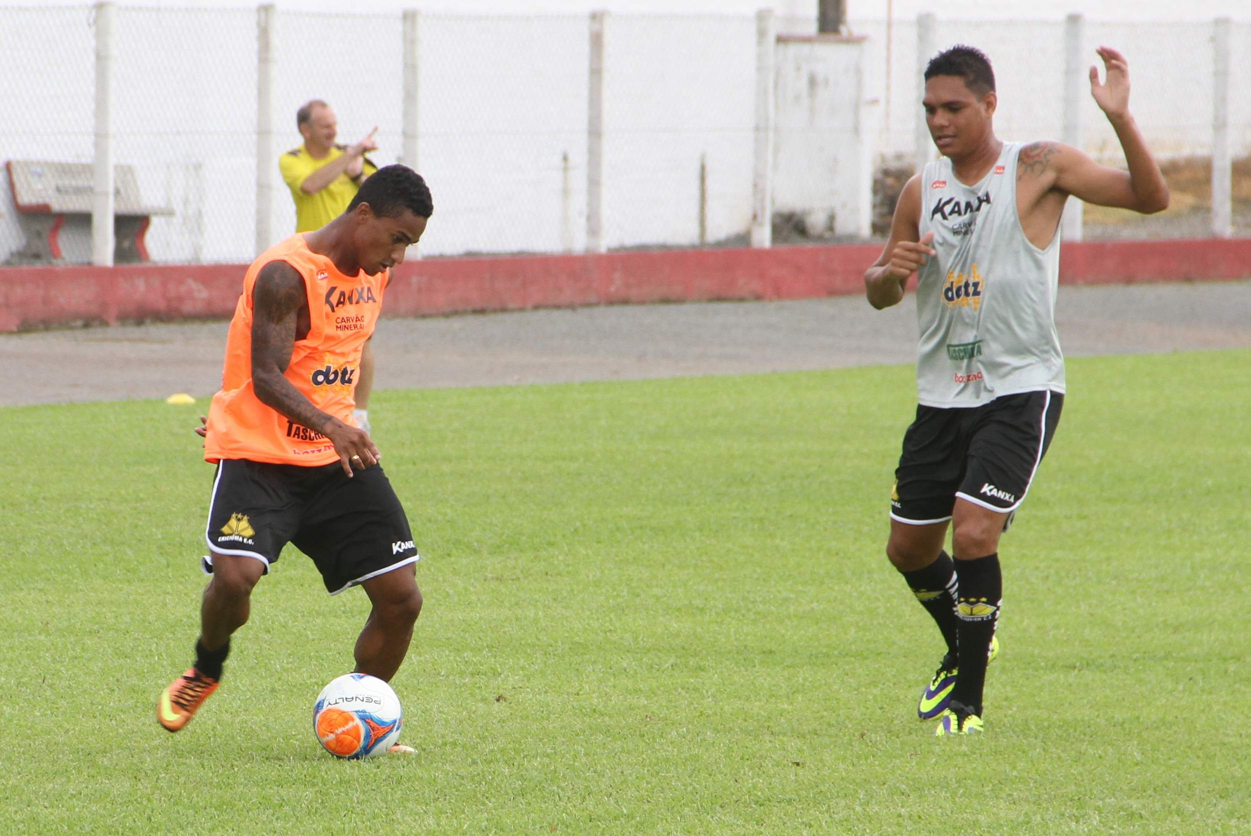 Legenda: Lateral direito Eduardo e meia Thiago Humberto durante treino do Criciúma no estádio do América, em Joinville, na manhã deste sábado (25/01)